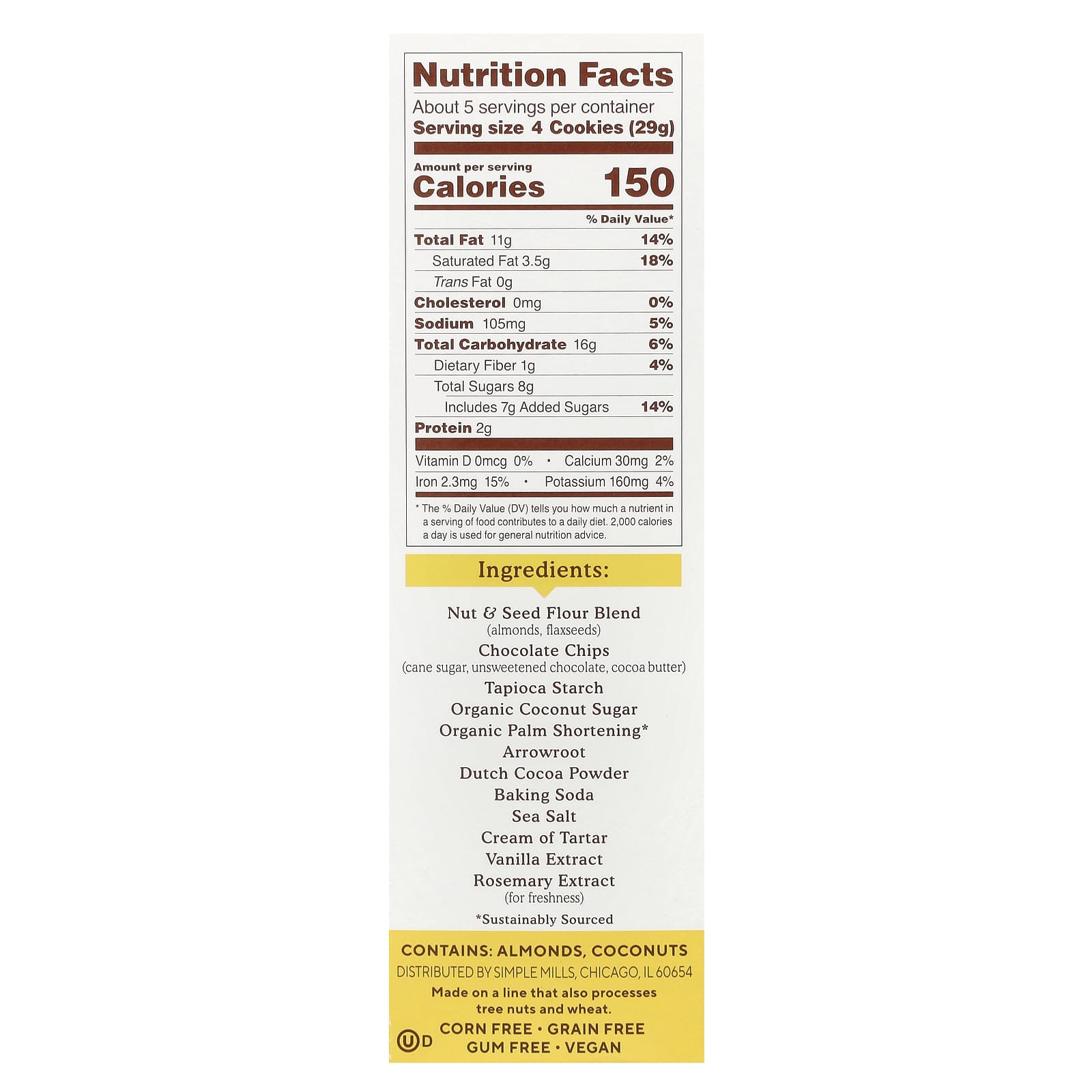 Nut & amp; смесь муки из семян (миндаль, семена льна), шоколадная крошка (тростниковый сахар, горький шоколад, какао-масло), тапиоковый крахмал, органический кокосовый сахар, органическое пальмовое масло с низким содержанием ненасыщенных жиров*, аррорут, какао-порошок, пищевая сода, морская соль, винный камень, экстракт ванили, экстракт розмарина (для свежести).