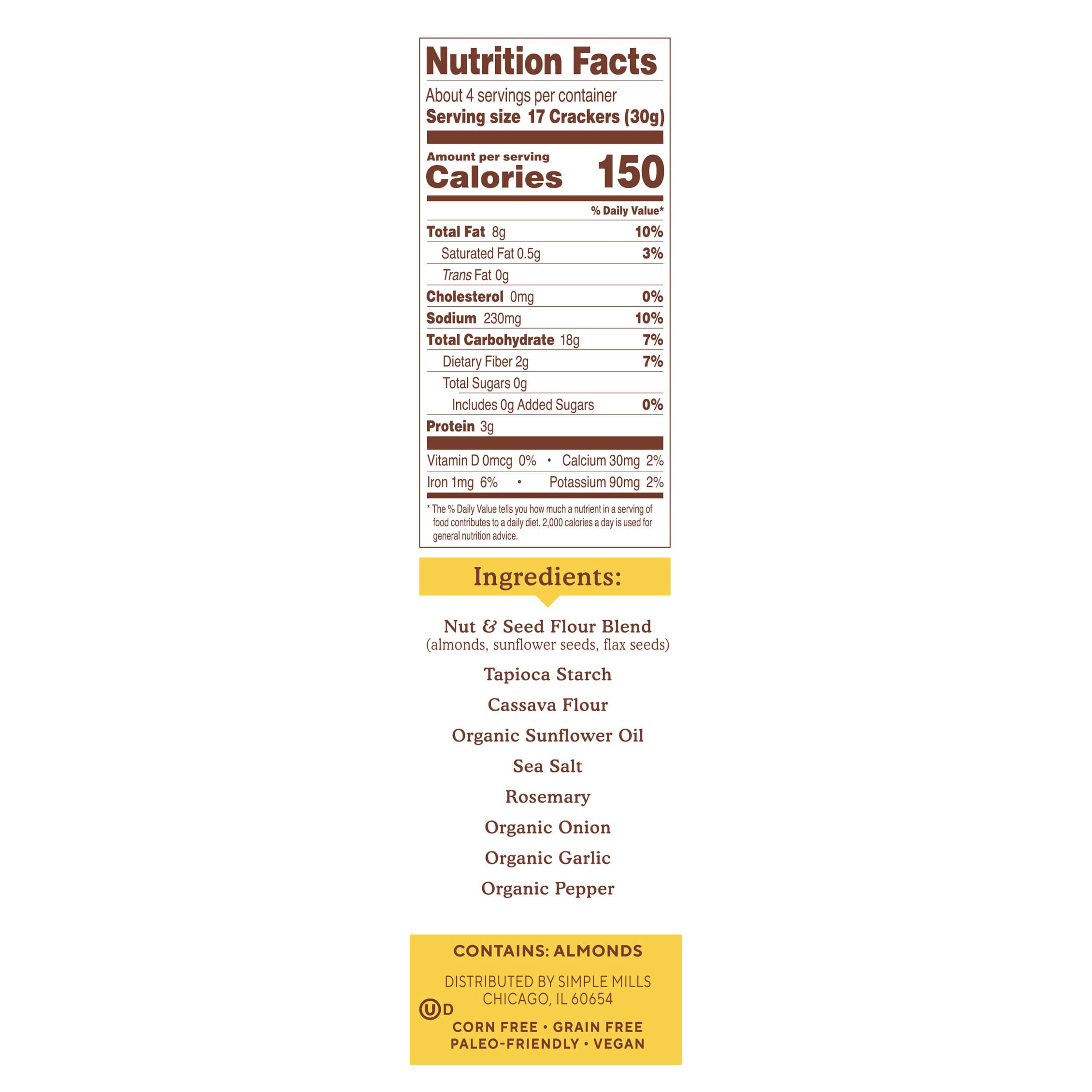 Смесь орехов и семян (миндаль, семена подсолнечника, семена льна), тапиока, маниока, органическое подсолнечное масло, органический розмарин, морская соль, органический лук, органический чеснок, органический перец, экстракт розмарина (для свежести).