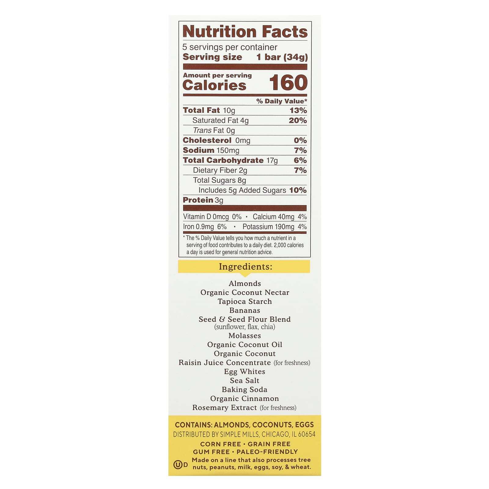 Simple Mills, Мягкие батончики из миндальной муки, банановый хлеб с орехами, 5 батончиков по 34 г (1,19 унции)