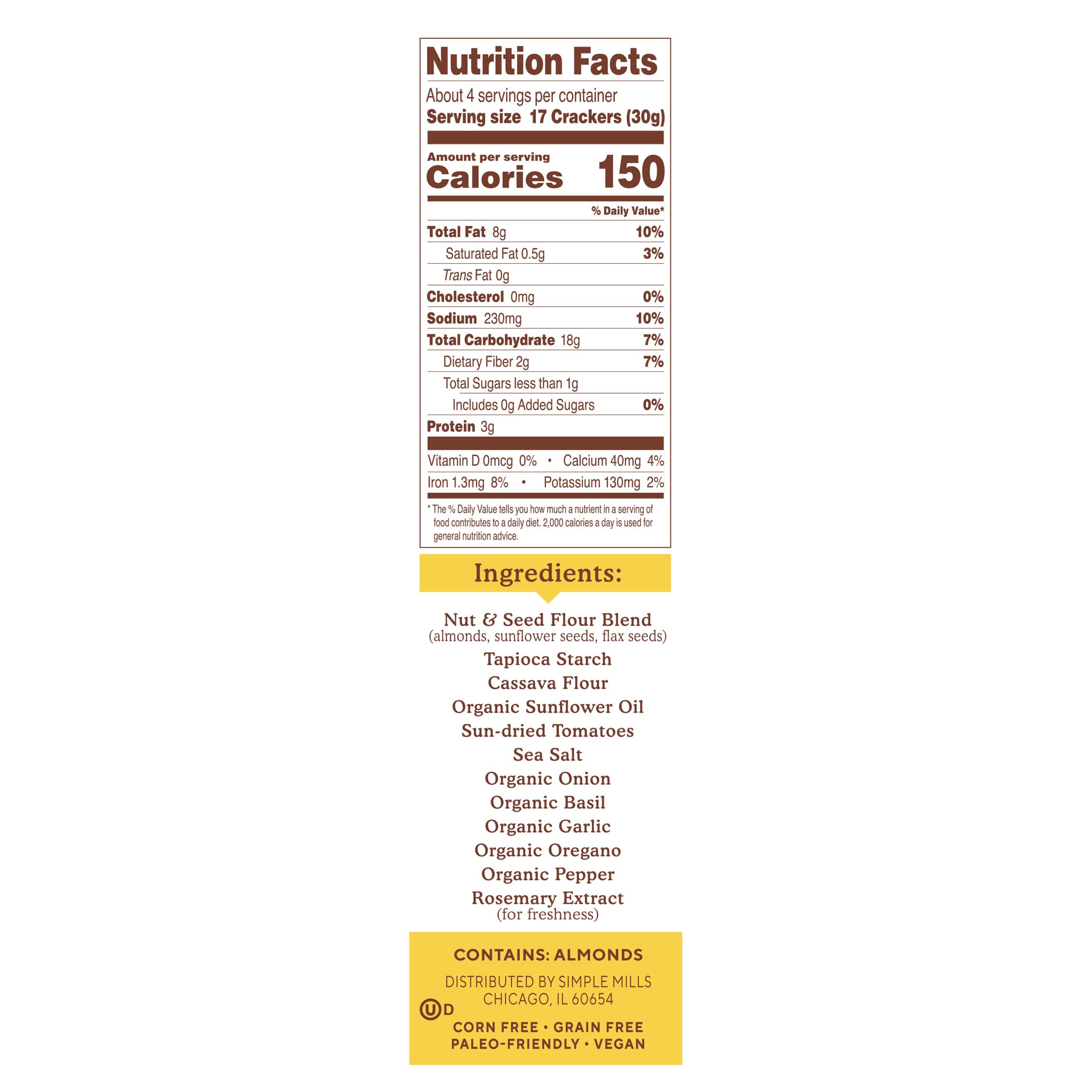 Simple Mills, Натуральное отсутствие глютена, мучные крекеры с миндалем, высушенные солнцем помидоры и базилик, 4,25 унции (120 г)