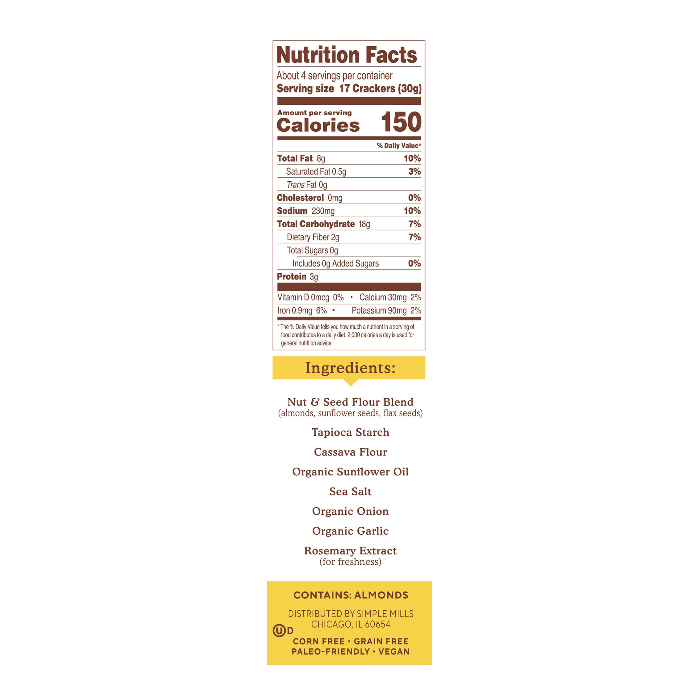 Смесь ореховой муки и муки из семян (миндаль, семена подсолнечника, семена льна), тапиоковый крахмал, мука из кассавы, органическое подсолнечное масло, морская соль, органический лук, органический чеснок, экстракт розмарина (для свежести).