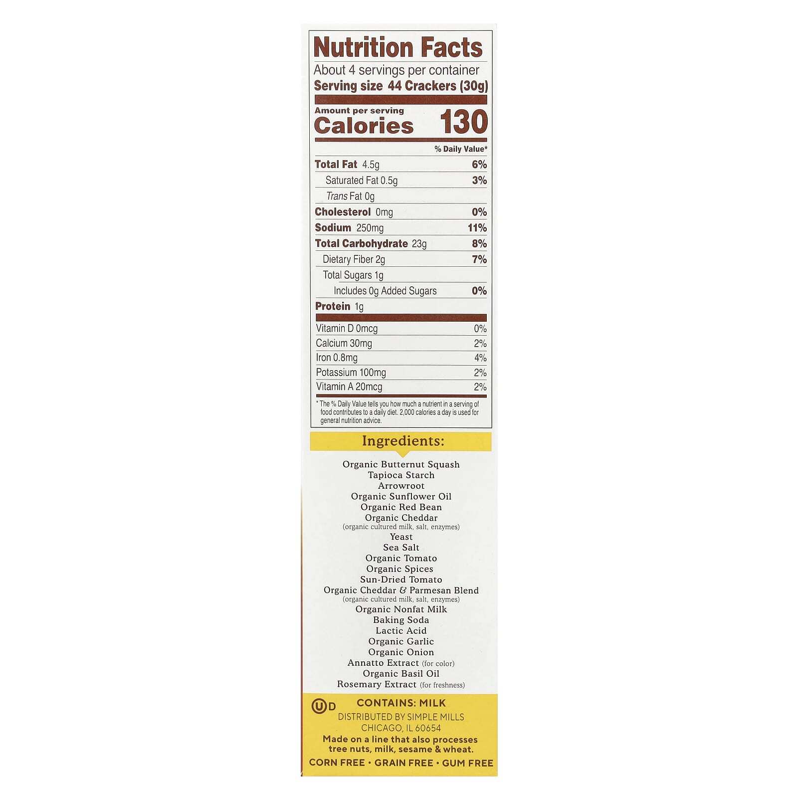 Органическая мускатная тыква, тапиоковый крахмал, аррорут, органическое подсолнечное масло, органическая красная фасоль, органический чеддер (органический кисло-молочный продукт, соль, ферменты), дрожжей, морская соль, органический томат, органические специи, вяленые томаты, органический чеддер смесь пармезана (органический кисло-молочный продукт, соль, ферменты), органическое обезжиренное молоко, пищевая сода, молочная кислота, органический чеснок, органический лук, экстракт аннато (краситель), органическое базиликовое масло, экстракт розмарина (для свежести).