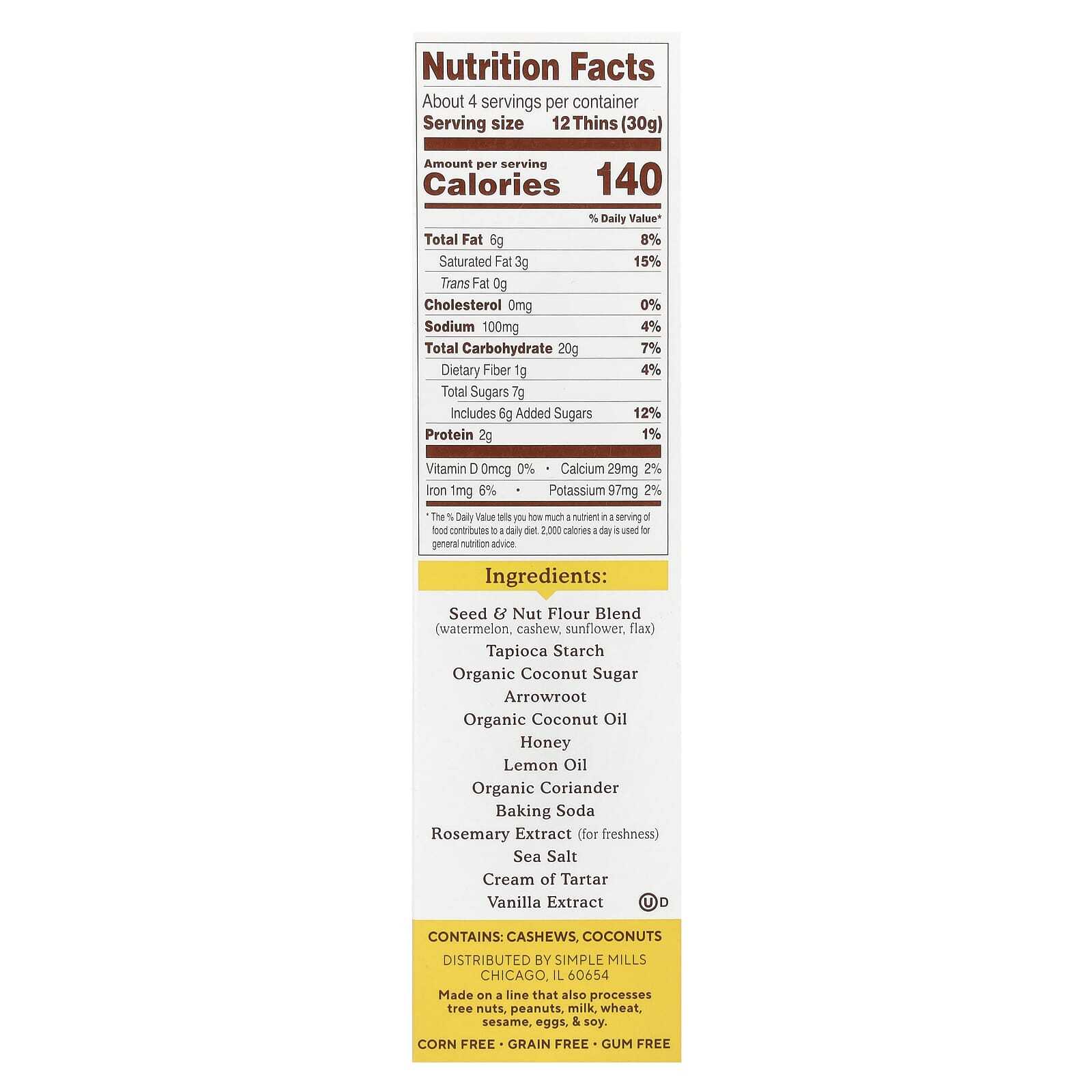 смесь муки из семян и орехов (арбуз, кешью, подсолнечник, лен, тапиоковый крахмал, органический кокосовый сахар, аррорут, органическое кокосовое масло, мед, лимонное масло, органический кориандр, пищевая сода, экстракт розмарина (для свежести), морская соль, винный камень, экстракт ванили.