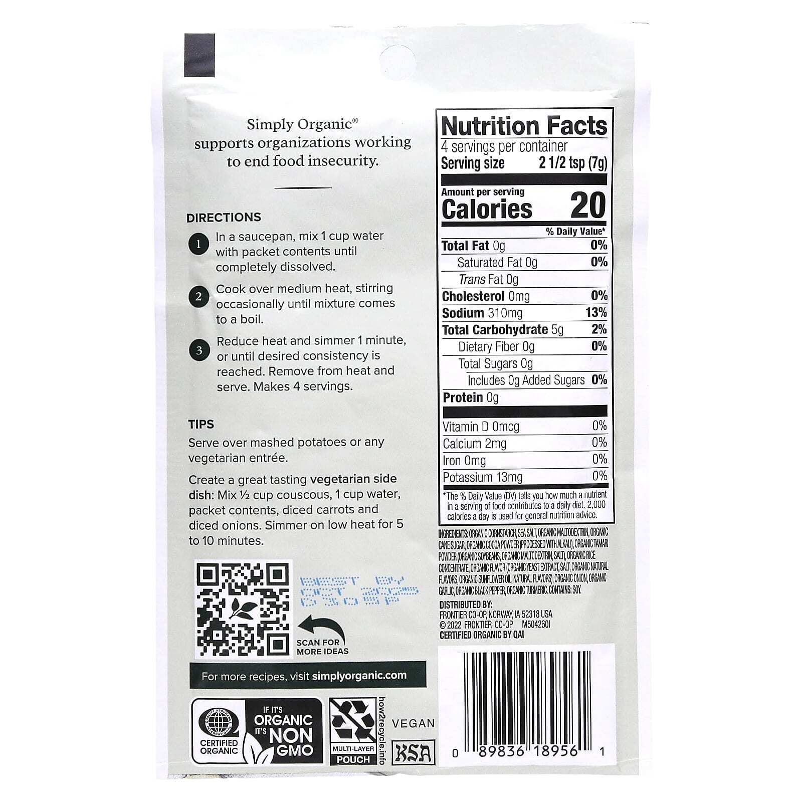органический кукурузный крахмал, морская соль, органический мальтодекстрин, органический тростниковый сахар, органический какао-порошок (обработанный щелочью), порошок из органической сои (органические соевые бобы, органический мальтодекстрин, соль), органический рисовый концентрат, органический ароматизатор (экстракт органических дрожжей, соль, органические натуральные ароматизаторы, органическое подсолнечное масло, натуральные ароматизаторы), органический лук, органический чеснок, органический черный перец, органическая куркума.