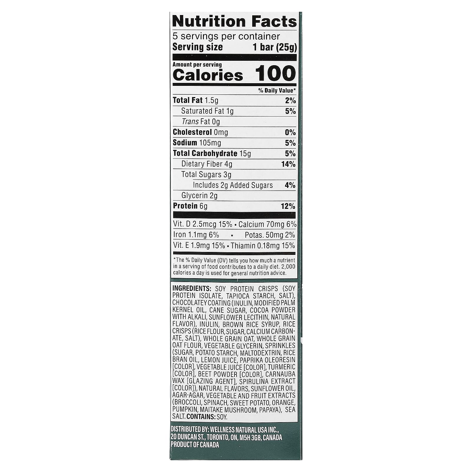 Чипсы из соевого протеина (изолят соевого протеина, крахмал тапиоки, соль), шоколадная глазурь (инулин, модифицированное пальмоядровое масло, тростниковый сахар, какао-порошок с щелочью, Лецитин подсолнечника, натуральный ароматизатор), инулина, сироп из бурого риса, рисовые чипсы (рисовая мука, сахар, карбонат кальция, соль), цельнозерновой овес, цельнозерновая овсяная мука, растительный глицерин, посыпка (сахар, картофельный крахмал, мальтодекстрин, масло из рисовых отрубей, лимонный сок, олеорезин паприки (краситель), овощной сок (краситель), куркума (краситель), свекольный порошок (краситель), карнаубский воск - глазурь, экстракт спирулины (краситель), натуральные ароматизаторы, подсолнечное масло, агар-агар, экстракты овощей и фруктов (брокколи, шпинат, батат, апельсин, тыква, гриб-баран, папайя), морская соль.