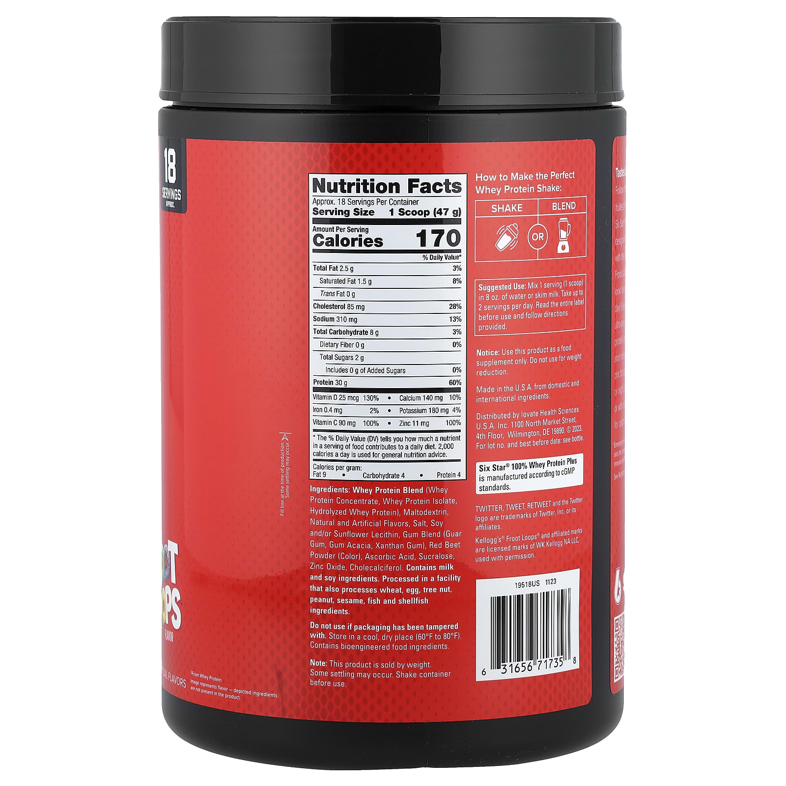 Follow Your Nose™ и попробуйте протеин с самым фруктовым вкусом Froot Loops™!Сывороточный протеин 100% Whey Protein Plus от Six Star® разработан для ежедневного питания.Теперь вы имеете незабываемый вкус хлопьев Kellog's Froot Loops™, и вы будете с удовольствием употреблять этот коктейль каждый день!Каждая порция содержит 30 г сверхчистого, быстро усваиваемого 100% сывороточного протеина и источник 4 витаминов и минералов, включая витамин C и цинк для дополнительной поддержки иммунитета. 1 .Она одинаково эффективна днем и вечером, после тренировки или игры или во время миски с хлопьями.