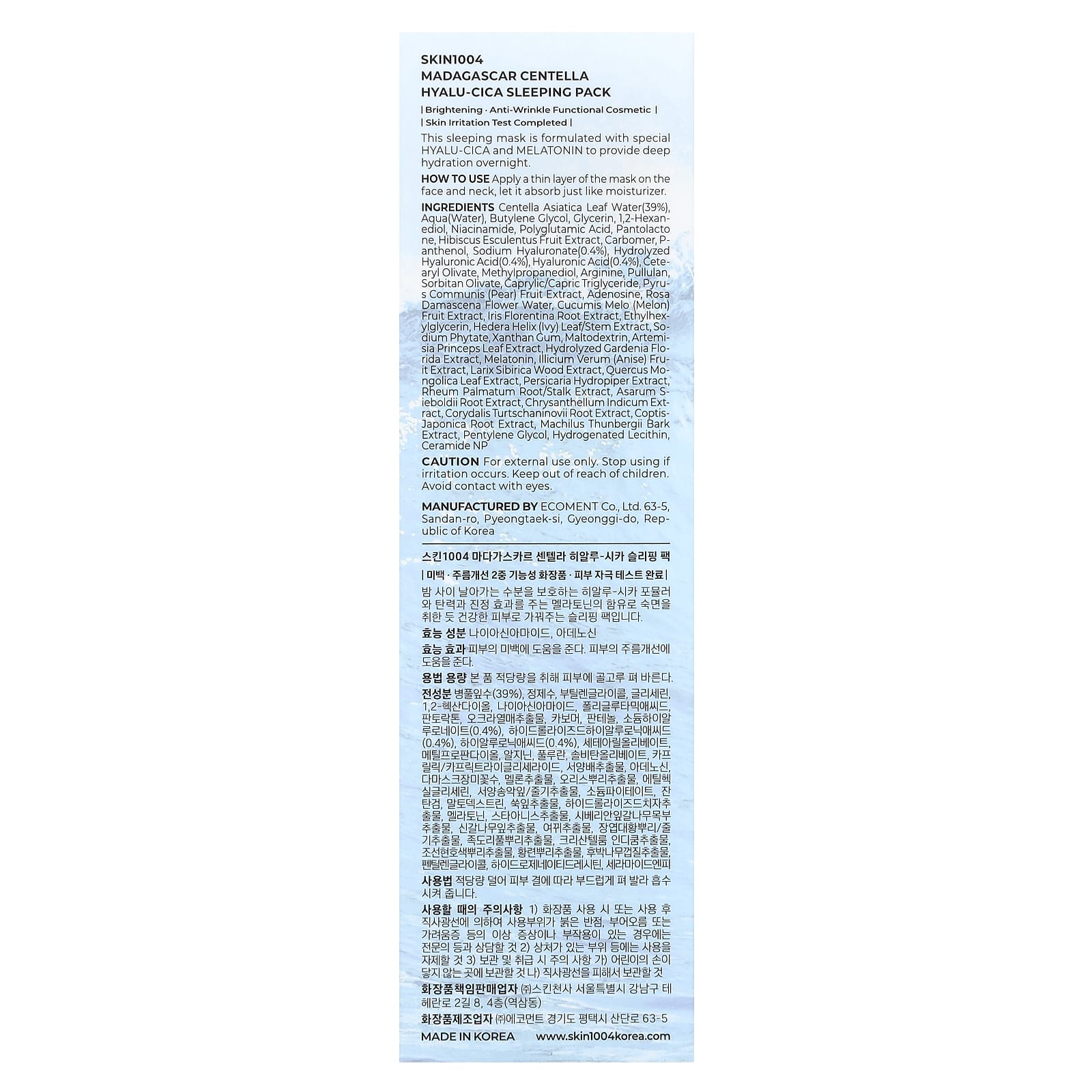 Вода из листьев центеллы азиатской (39%), вода, бутиленгликоль, глицерин, 1,2-гександиол, никотинамид, полиглутаминовая кислота, пантолактон, экстракт плодов гибискуса (Hibiscus esculentus), карбомер, пантенол, гиалуронат натрия (0,4%), гидролизованная гиалуроновая кислота (0,4%), гиалуроновая кислота (0,4%), цетеарил оливат, метилпропандиол, аргинин, пуллулан, сорбитан оливат, каприловый / каприновый триглицерид, экстракт плодов груши (Pyrus communis), аденозин, вода из цветков дамасской розы, экстракт плодов дыни (Cucumis melo), экстракт корня ириса флорентийского, этилгексилглицерин, экстракт листьев / стеблей плюща (Hedera helix), фитат натрия, ксантановая камедь, мальтодекстрин, экстракт листьев полыни (Artemisia princeps), гидролизованный экстракт гардении флоридской, мелатонин, экстракт плодов аниса (Illicium verum), экстракт древесины ларикса сибирского, экстракт листьев Quercus mongolica, экстракт водоросли водоросли, экстракт корня / стебля Rheum palmatum, экстракт корня Asarum sieboldii, экстракт хризантеллы индийской, экстракт корня Corydalis turtschaninovii, экстракт корня японской (Coptis), экстракт коры Machilus thunbergii, пентиленгликоль, гидрогенизированный лецитин, керамид NP.
