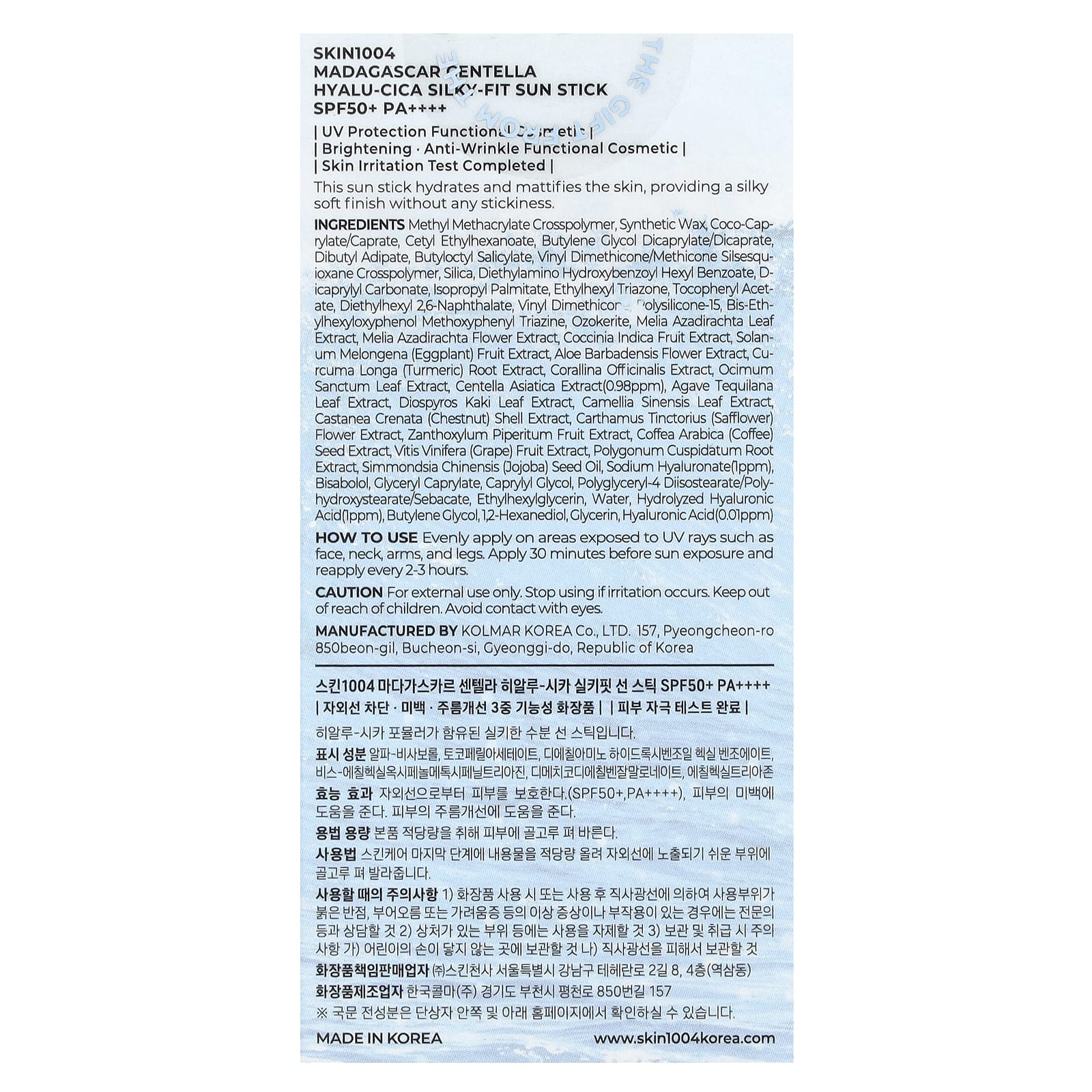 Метилметакрилат кроссполимер, синтетический воск, кококаприлат / капрат, цетил этилгексаноат, бутиленгликоль дикаприлат / дикапрат, дибутиладипат, бутилоктил салицилат, винилдиметикон / метикон силсесквиоксан кроссполимер, диоксид кремния, диэтиламиногидроксибензоил гексилбензоат, дикаприлил карбонат, изопропилпальмитат, этилгексил триазон, токоферилацетат, диэтилгексил 2,6-нафталат, винил диметикон, полисиликон-15, бис-этилгексилоксифенол, метоксифенилтриазин, озокерит, экстракт листьев мелии азадирахты, экстракт цветков мелии азадирахты, экстракт плодов кокцинии индийской, экстракт плодов баклажана (Solanum melongena), экстракт цветков алоэ вера, экстракт корня куркумы (Curcuma longa), экстракт кораллины лекарственной, экстракт листьев священного (Ocimum sanctum), экстракт центеллы азиатской (0,98 част. / млн), экстракт листьев агавы текиланы, экстракт листьев диоспироса каки, экстракт листьев камелии китайской, экстракт скорлупы каштана (castanea crenata), Carthamus tinctorius (экстракт цветков сафлора, экстракт плодов зантоксилума (Zanthoxylum piperitum), экстракт семян кофе арабика (Coffea arabica), экстракт плодов винограда, экстракт корня многоугольника кунжутного (Polygonum cuspidatum), масло семян жожоба (Simmondsia chinensis), гиалуронат натрия (1 част. / млн), бисаболол, глицерил каприлат, каприлил гликоль, полиглицерил-4 диизостеарат / полигидроксистеарат / себацинат, этилгексилглицерин, вода, гидролизованная гиалуроновая кислота (1 част. / млн), бутиленгликоль, 1,2-гександиол, глицерин, гиалуроновая кислота (0,01 част. / млн).