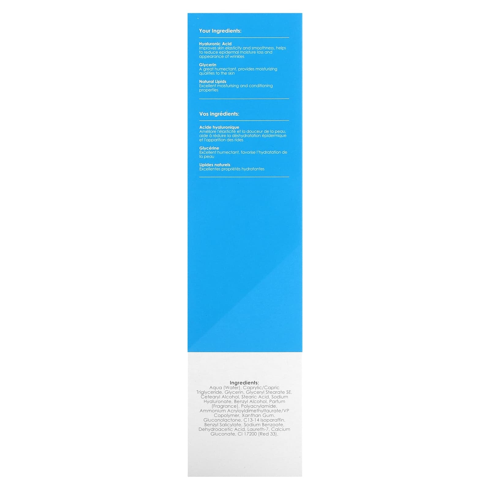 Вода (Aqua), каприловый/каприновый триглицерид, глицерин, глицерил стеарат эмульгирующий, цетеариловый спирт, стеариновая кислота, гиалуронат натрия, бензиловый спирт, парфюмерная композиция (отдушка), полиакриламид, аммоний акрилоилдиметилтаурат/ВП сополимер, ксантановая камедь, глюконолактон, c13-14 изопарафин, бензилсалицилат, бензоат натрия, дегидроуксусная кислота, лаурет-7, глюконат кальция, CI 17200 (красный 33).