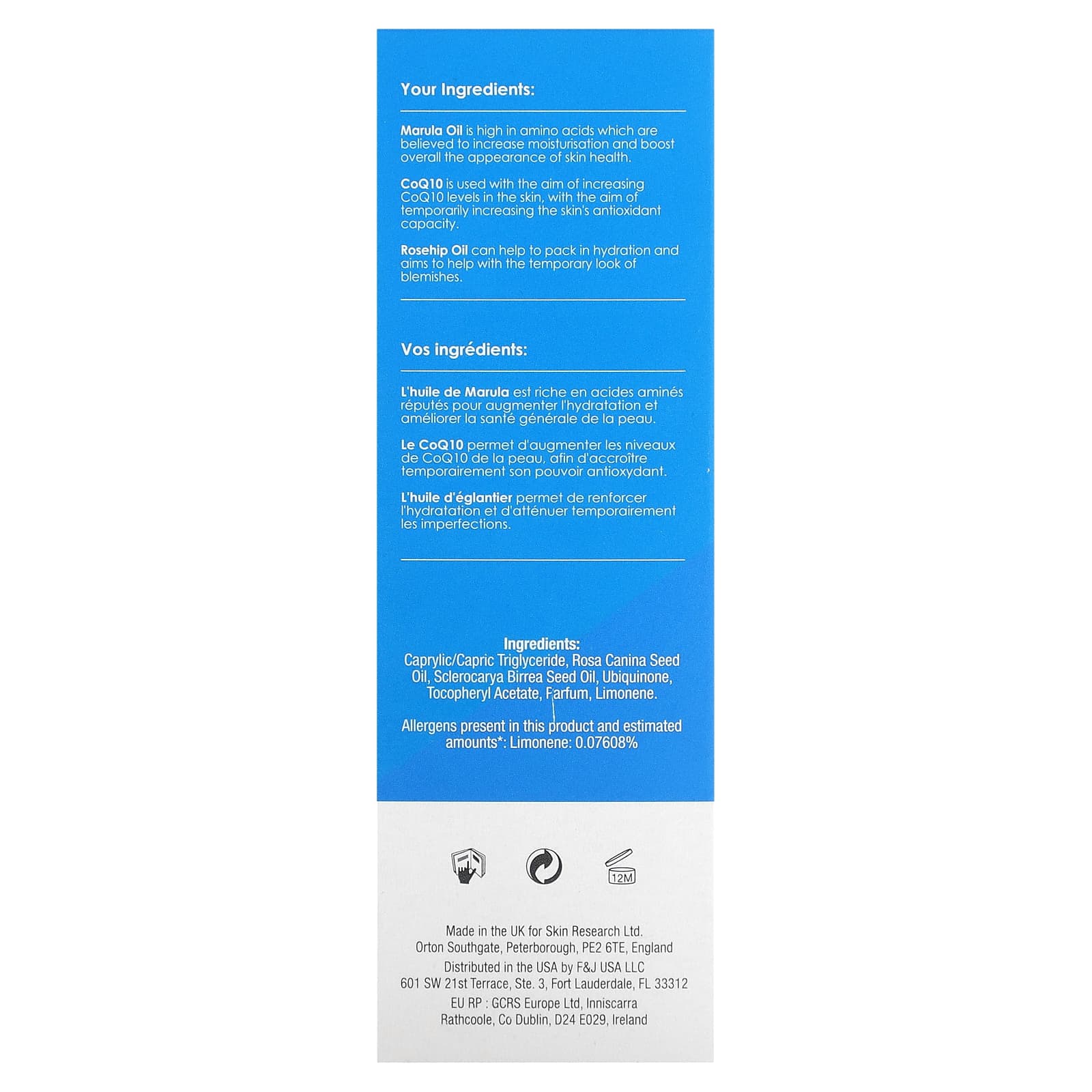 Каприловый/каприновый триглицерид, масло семян шиповника (Rosa canina), масло семян марулы (Sclerocarya birrea), убихинон, токоферилацетат, отдушка, лимонен.
