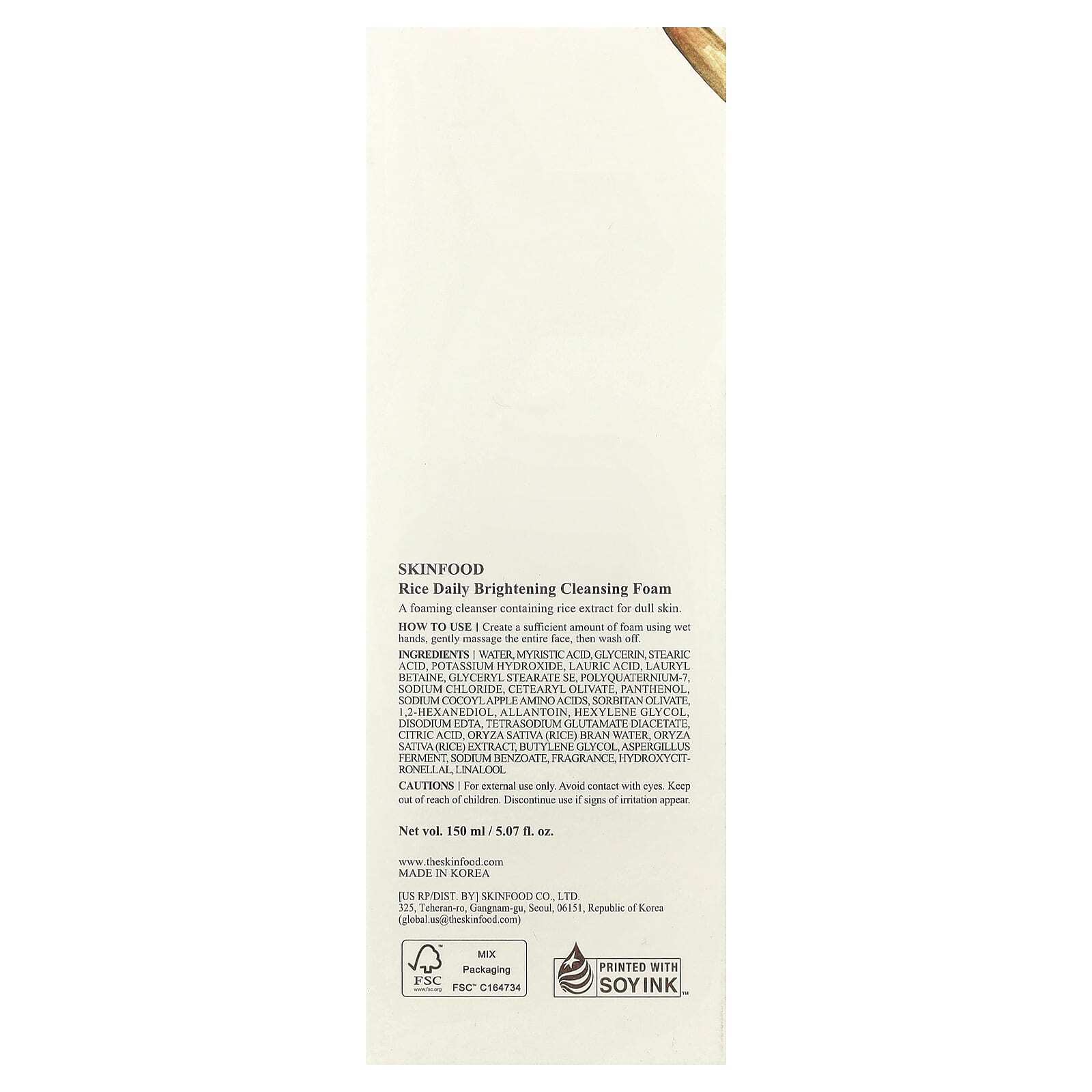 Вода, миристиновая кислота, глицерин, стеариновая кислота, гидроксид калия, лауриновая кислота, лаурил бетаин, глицерил стеарат эмульгирующий, поликватерниум-7, хлорид натрия, цетеарил оливат, пантенол, кокоил натрия, яблочные аминокислоты, сорбитан оливат, 1,2-гександиол, аллантоин, гексиленгликоль, двунатриевая ЭДТК, диацетат глутамата тетранатрия, лимонная кислота, вода из рисовых отрубей (Oryza sativa), экстракт риса (Oryza sativa), бутиленгликоль, продукт ферментации аспергилла, бензоат натрия, отдушка, гидроксицитронеллаль, линалоола.