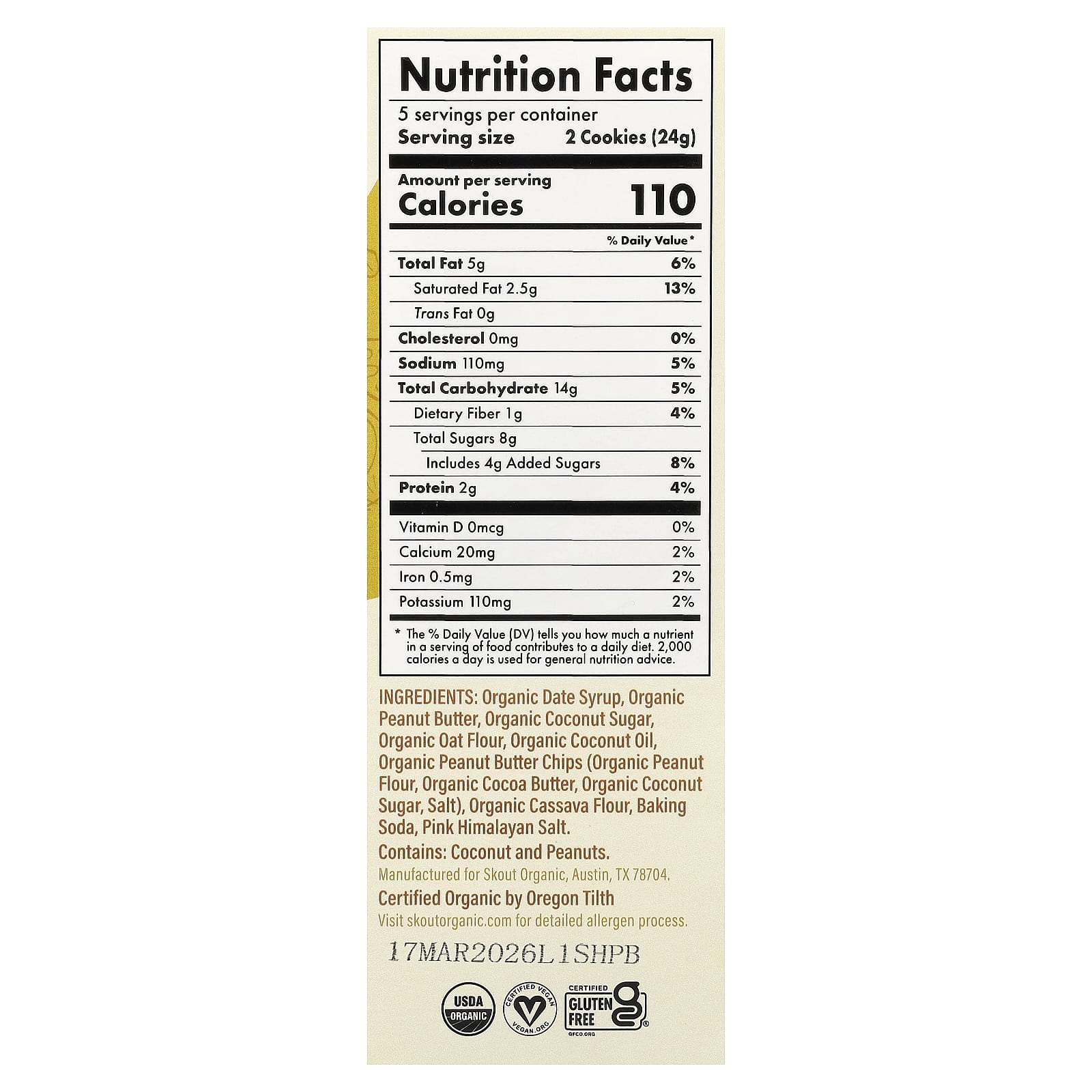 Органический финиковый сироп, органическая арахисовая паста, органический кокосовый сахар, органическая овсяная мука, органическое кокосовое масло, чипсы из органической арахисовой пасты (органическая арахисовая мука, органическое какао-масло, органический кокосовый сахар, соль), органическая мука из кассавы, пищевая сода, розовая гималайская соль.
