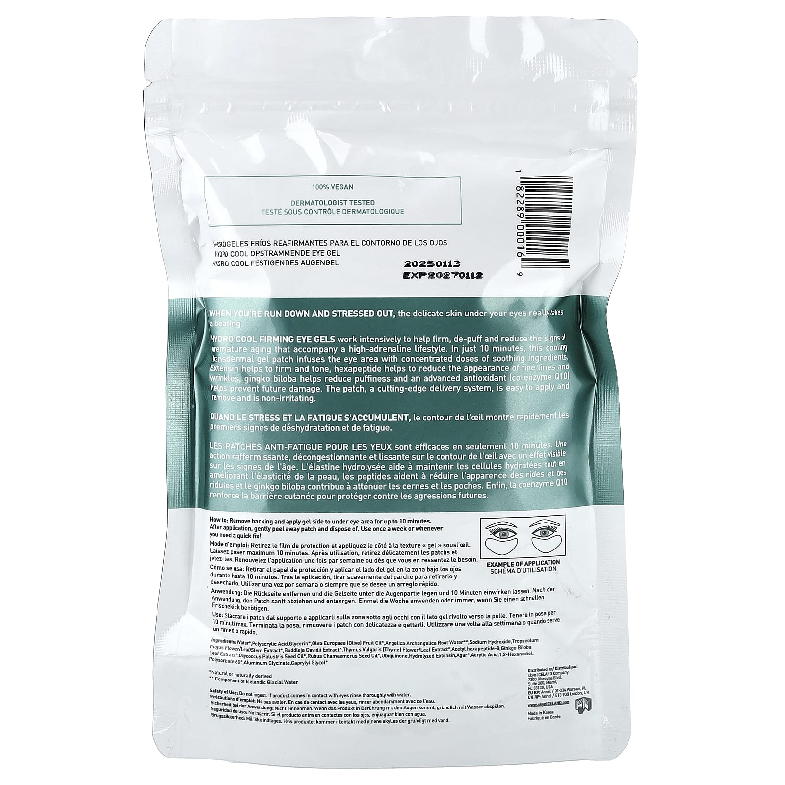 Охлаждающие гидрогели для кожи вокруг глаз интенсивно работают, помогая повысить упругость кожи, снять отечность и уменьшить признаки преждевременного старения, сопровождающие образ жизни с высоким содержанием адреналина. Этот охлаждающий трансдермальный гелевой патч всего за 10 минут наполняет область вокруг глаз концентрированными дозами успокаивающих ингредиентов. Экстензин помогает укрепить и тонизировать кожу, гексапептид помогает визуально уменьшить мелкие и глубокие морщинки, гинкго билоба помогает уменьшить отечность, а улучшенный антиоксидант (коэнзим Q10) помогает предотвратить повреждения в будущем. Пластырь — это передовая система доставки, которая легко наносится и снимается, а также не вызывает раздражения.