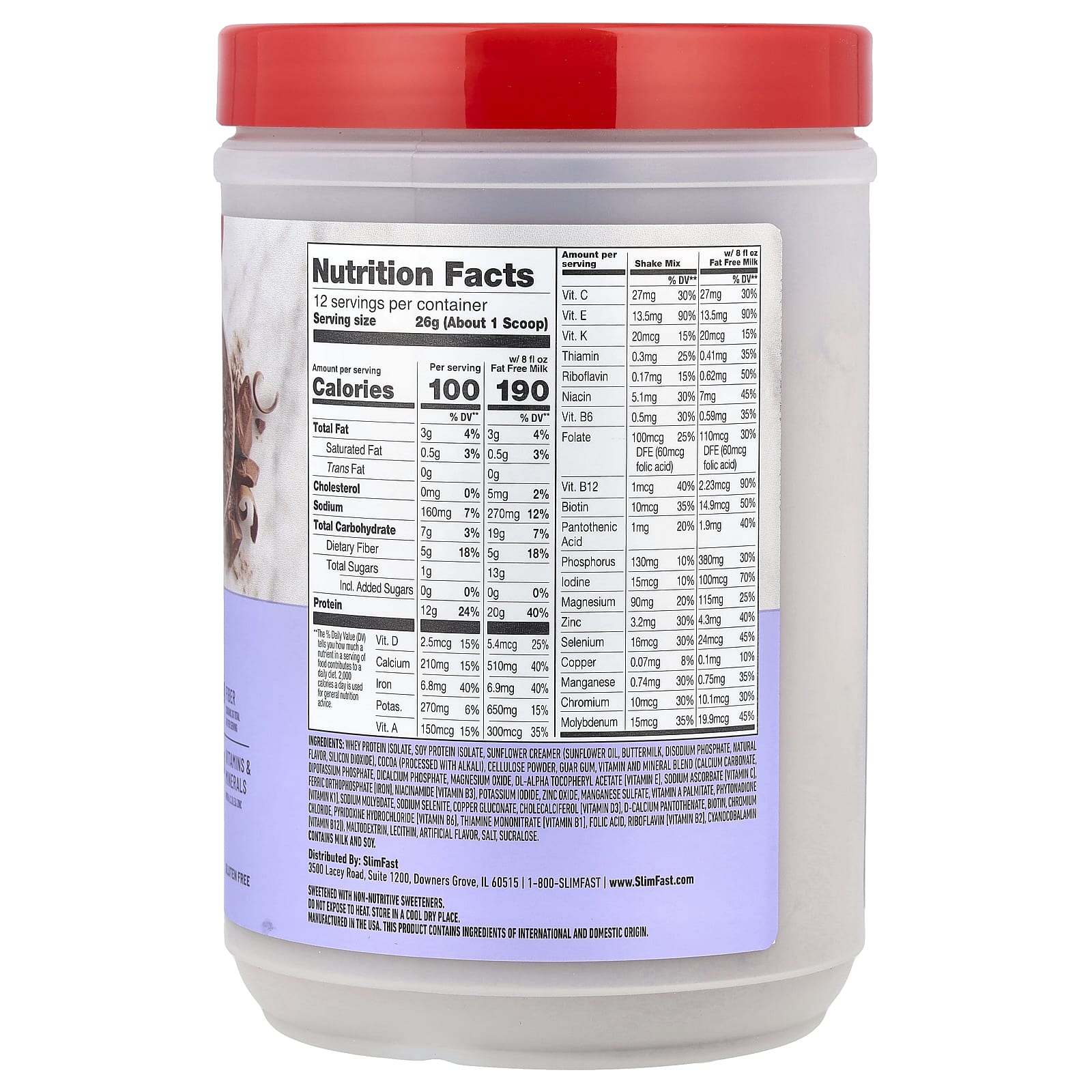 Изолят сывороточного протеина, изолят соевого белка, забеливатель из подсолнечника (подсолнечное масло, пахта, динатрия фосфат, натуральный ароматизатор, диоксид кремния), какао (обработанное щёлочью), целлюлозный порошок, гуаровая камедь, смесь витаминов и минералов (карбонат кальция, дикалийфосфат, дикальций фосфат, оксид магния, dl-альфа токоферилацетат [витамин E], аскорбат натрия [витамин C], ортофосфат железа [железо], никотинамид [витамин B3], йодид калия, оксид цинка, сульфат марганца, витамин A (пальмитат), фитонадион (витамин K1), молибдат натрия, селенит натрия, глюконат меди, холекальциферол [витамин D3], d-пантотенат кальция, биотин, хлорид хрома, пиридоксина гидрохлорид [витамин B6], мононитрат тиамина [витамин B1], фолиевая кислота, рибофлавин [витамин B2], цианокобаламин (витамин B12), мальтодекстрин, лецитин, искусственных ароматизаторов, соль, сукралоза.
