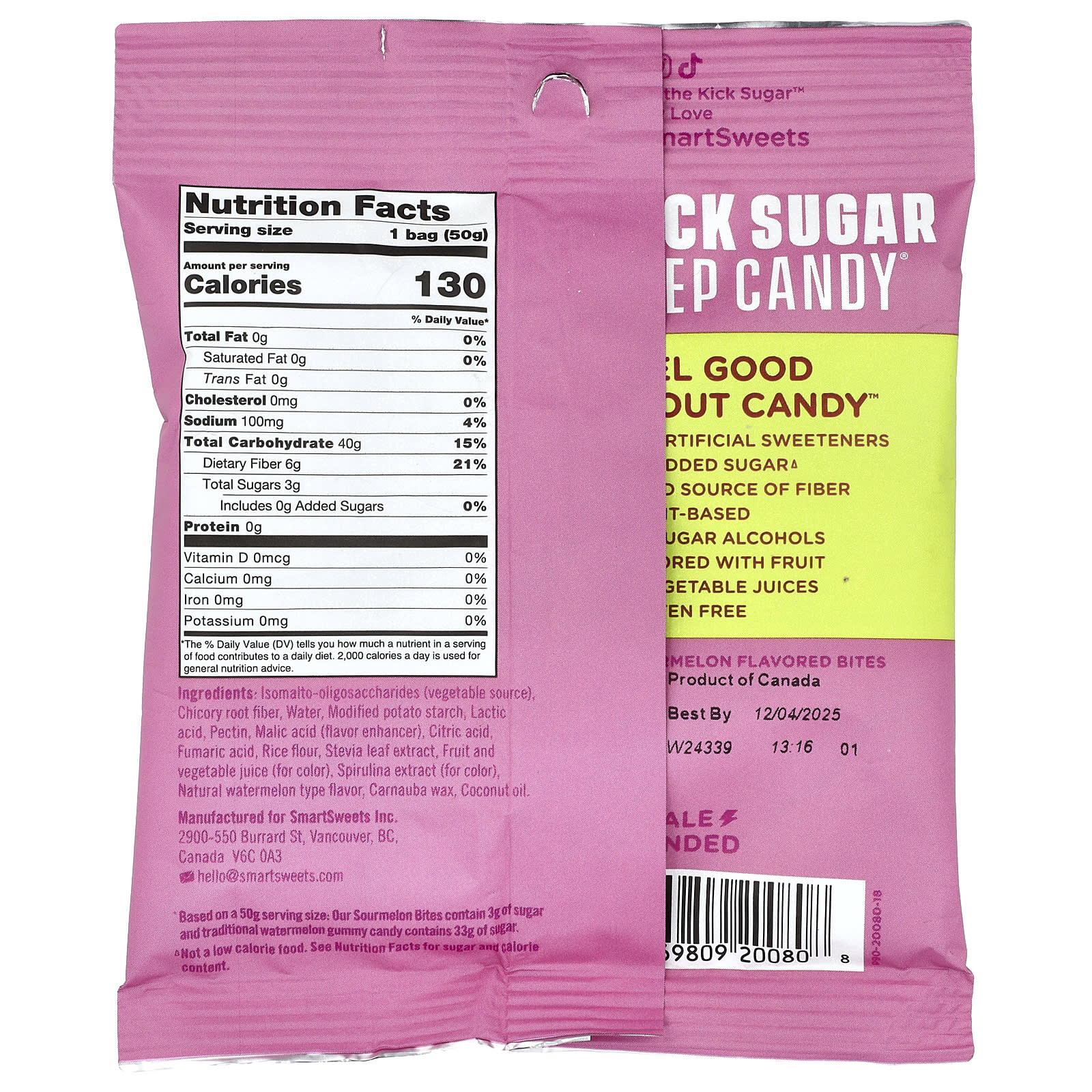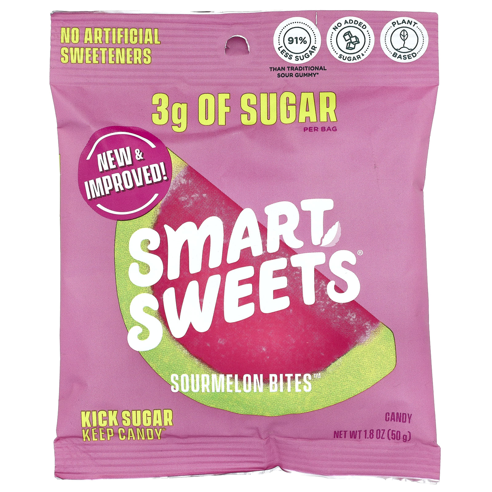 * При условии размера порции в 50 г: Наши жевательные конфеты Sourmelon содержат 3 г сахара, а традиционные арбузные жевательные конфеты содержат 33 г сахара.