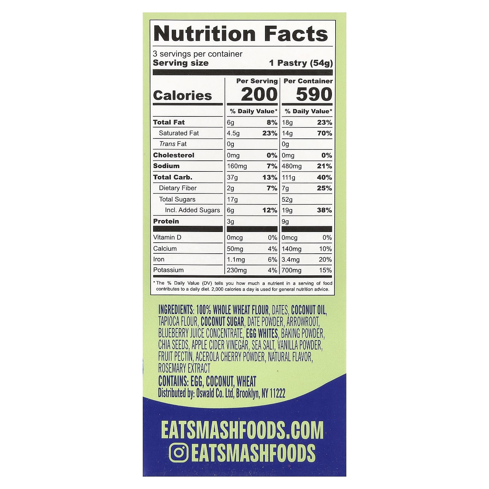 100% цельнозерновая пшеничная мука, финики, кокосовое масло, тапиоковая мука, кокосовый сахар, порошок из фиников, аррорут, концентрат сока голубики, яичный белок, разрыхлитель, семена чиа, яблочный уксус, морская соль, ванильный порошок, фруктовый пектин, порошок из вишни ацеролы, натуральный ароматизатор, экстракт розмарина.