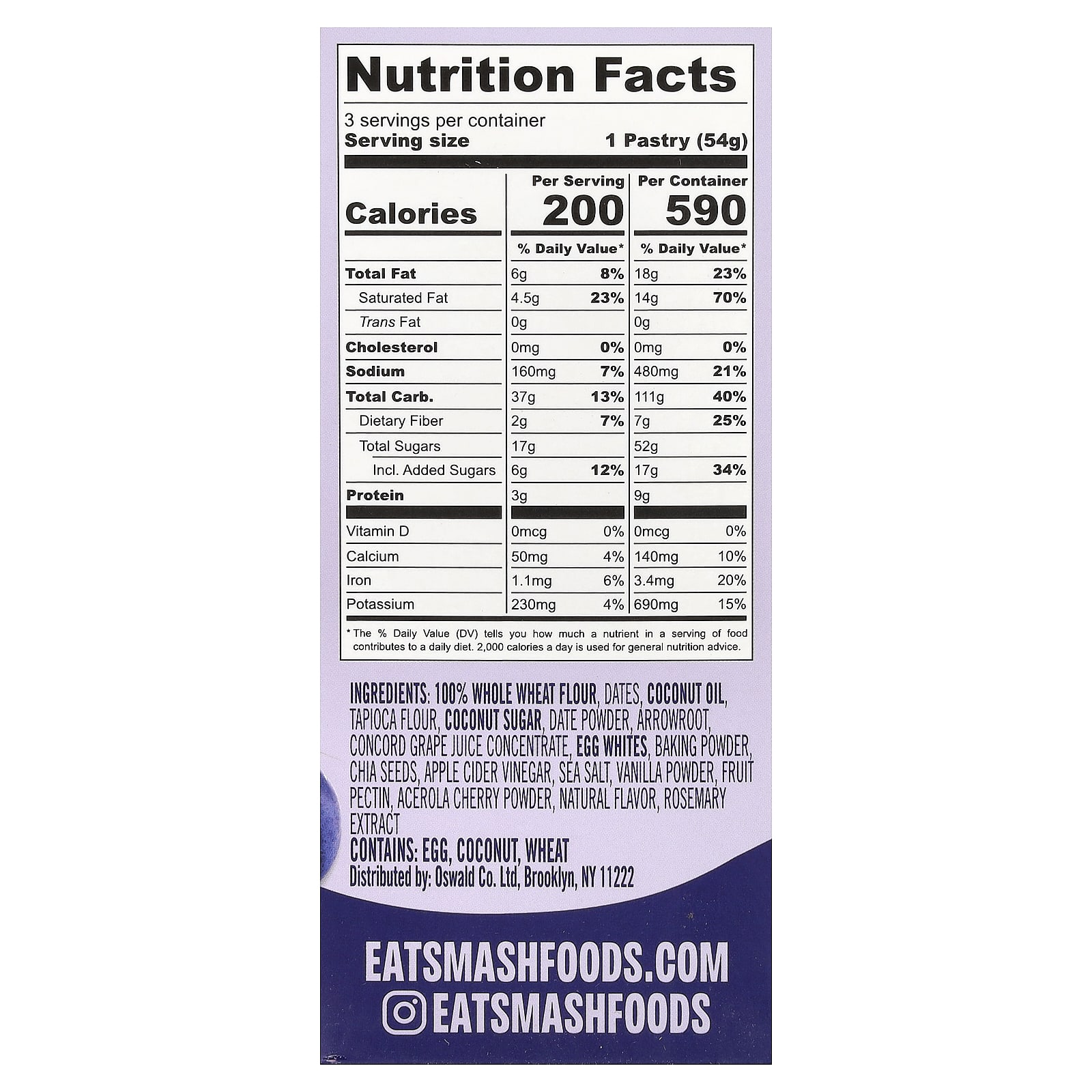 100% цельнозерновая пшеничная мука, финики, кокосовое масло, тапиоковая мука, кокосовый сахар, порошок из фиников, аррорут, концентрат виноградного сока конкорд, яичный белок, разрыхлитель, семена чиа, яблочный уксус, морская соль, ванильный порошок, фруктовый пектин, порошок из вишни ацеролы, натуральный ароматизатор, экстракт розмарина.