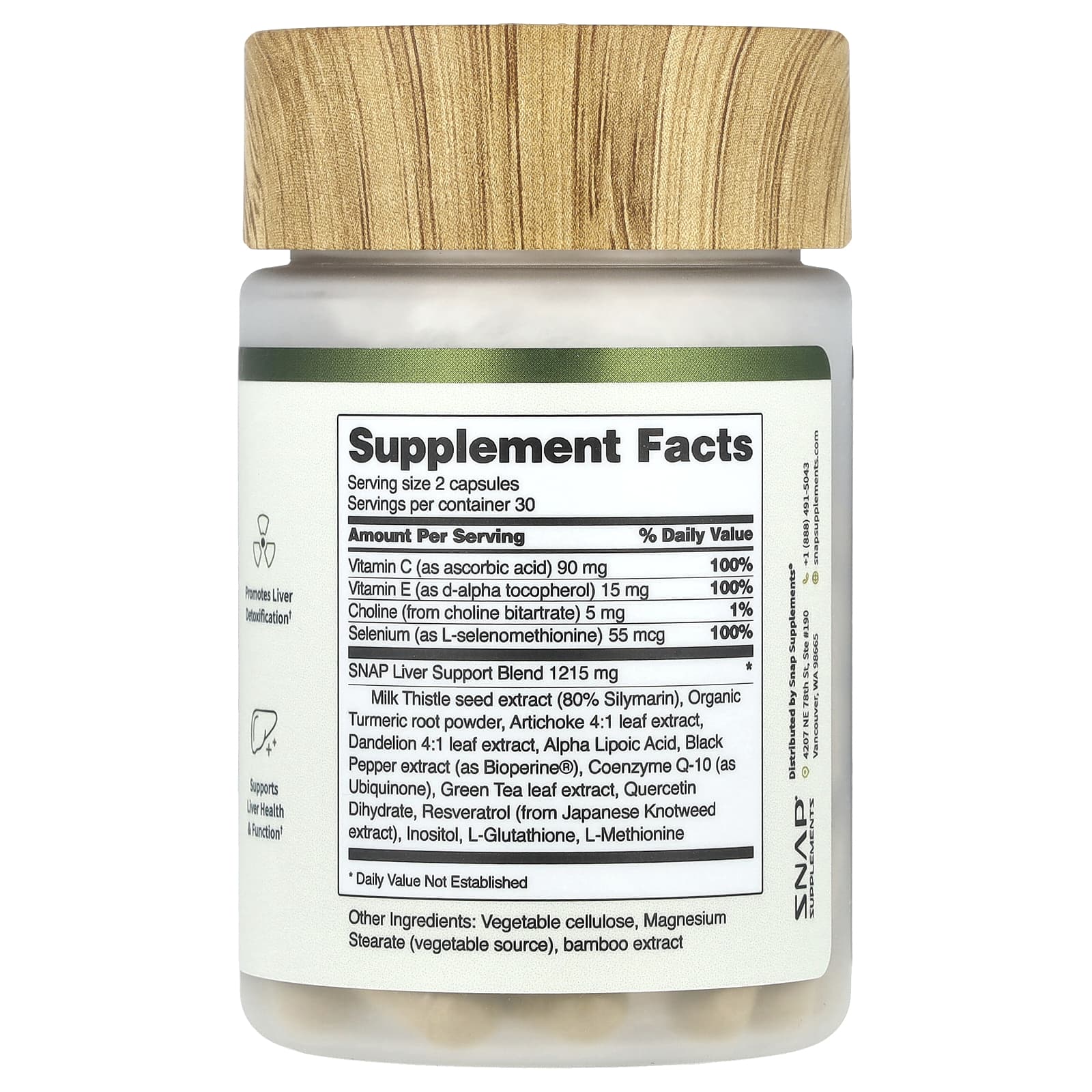 | Смесь для поддержки печени SNAP экстракт семян расторопши (80% силимарина), порошок из корня органической куркумы, экстракт листьев артишока 4:1, экстракт листьев одуванчика 4:1, альфа-липоевая кислота, экстракт черного перца (в виде Bioperine®), коэнзим Q10 (в виде убихинона) , экстракт листьев зеленого чая, дигидрат кверцетина, ресвератрол (из экстракта рейнутрии японской), инозитол, L-глутатион, L-метионин | 1215 мг | * |