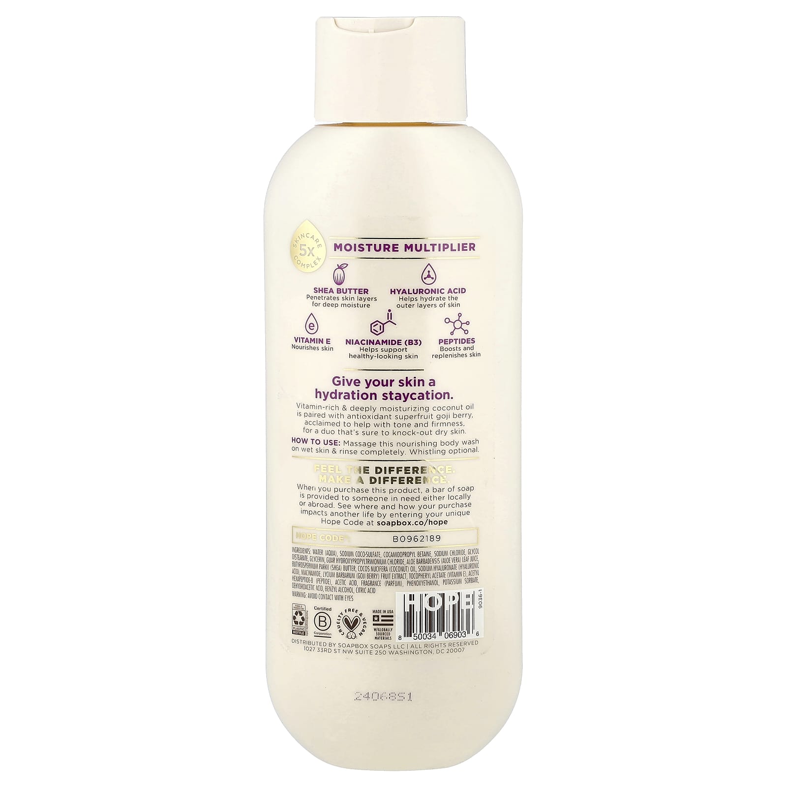 Вода, кокосульфат натрия, кокамидопропилбетаин, хлорид натрия, гликоль дистеарат, глицерин, гуар гидроксипропилтримония хлорид, сок листьев алоэ вера (Aloe barbadensis), масло ши (Butyrospermum parkii), кокосовое масло (Cocos nucifera), гиалуронат натрия (гиалуроновая кислота), никотинамид, экстракт ягод годжи (Lycium barbarum), токоферилацетат (витамин Е), ацетил гексапептид-8 (пептид), уксусная кислота, отдушка (парфюмерная композиция), феноксиэтанол, сорбат калия, дегидроуксусная кислота, бензиловый спирт, лимонная кислота.