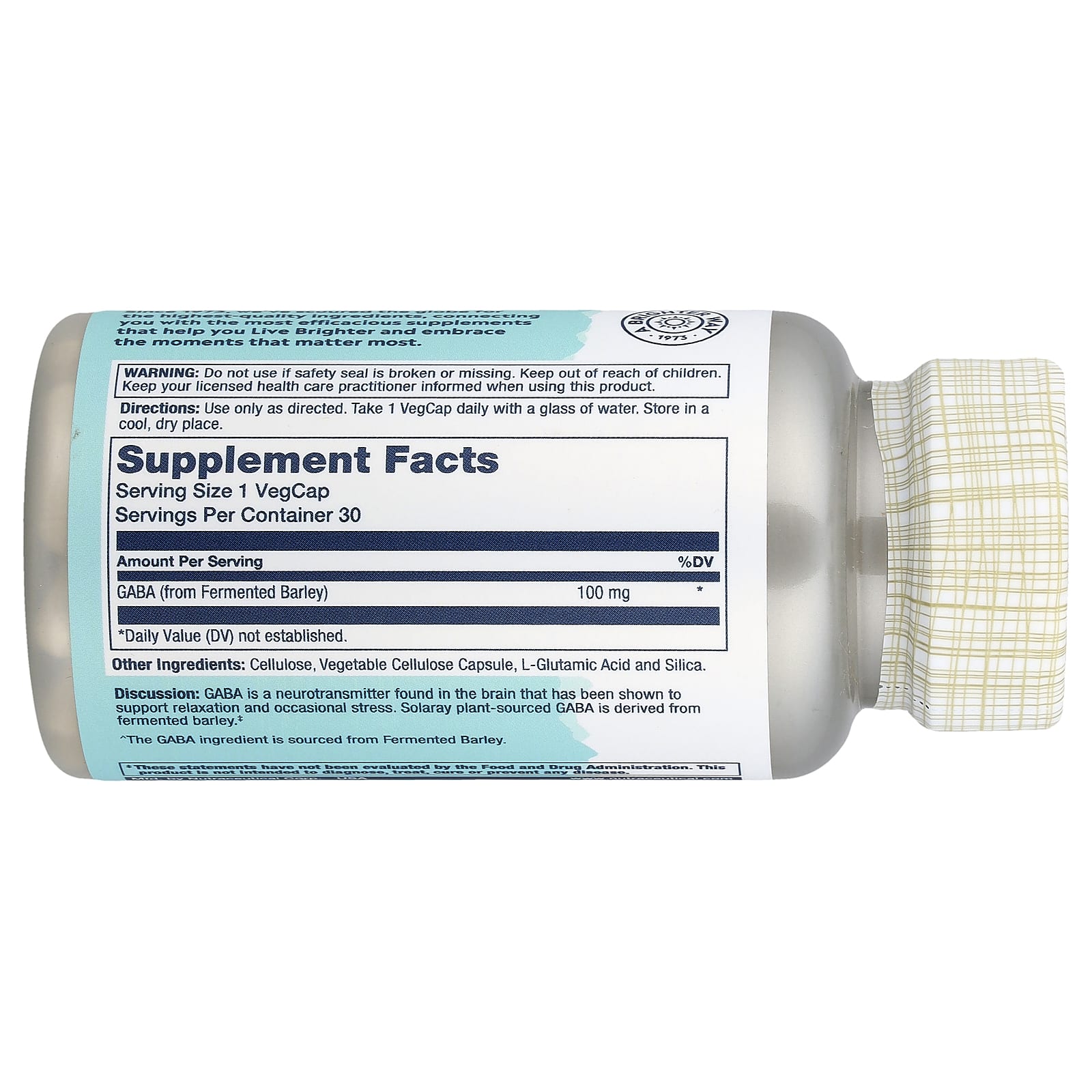 Описание. ГАМК — это нейромедиатор, содержащийся в мозге, который, как было доказано, способствует расслаблению и борьбе с периодическим стрессом. ГАМК растительного происхождения Solaray получают из ферментированного ячменя.