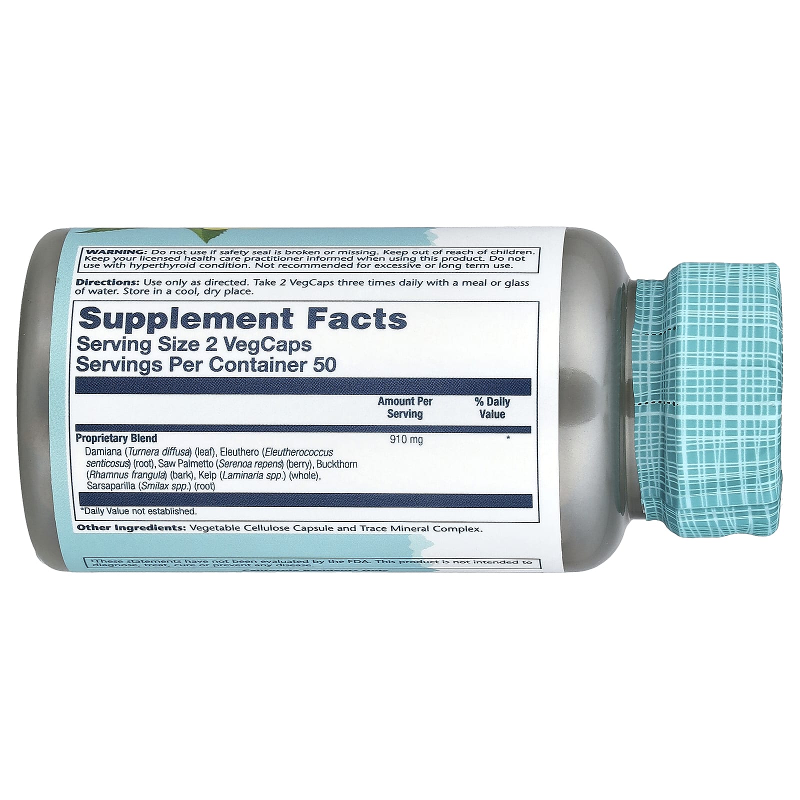 | Запатентованная смесь листья дамианы (Turnera diffusa), корень женьшеня (Eleutherococcus senticosus), ягоды серенои (Serenoa repens), кора облепихи (Rhamnus franula), бурые водоросли (вида Laminaria) (цельное), сарсапарилла (вид Smilax) корень | 910 мг | * |