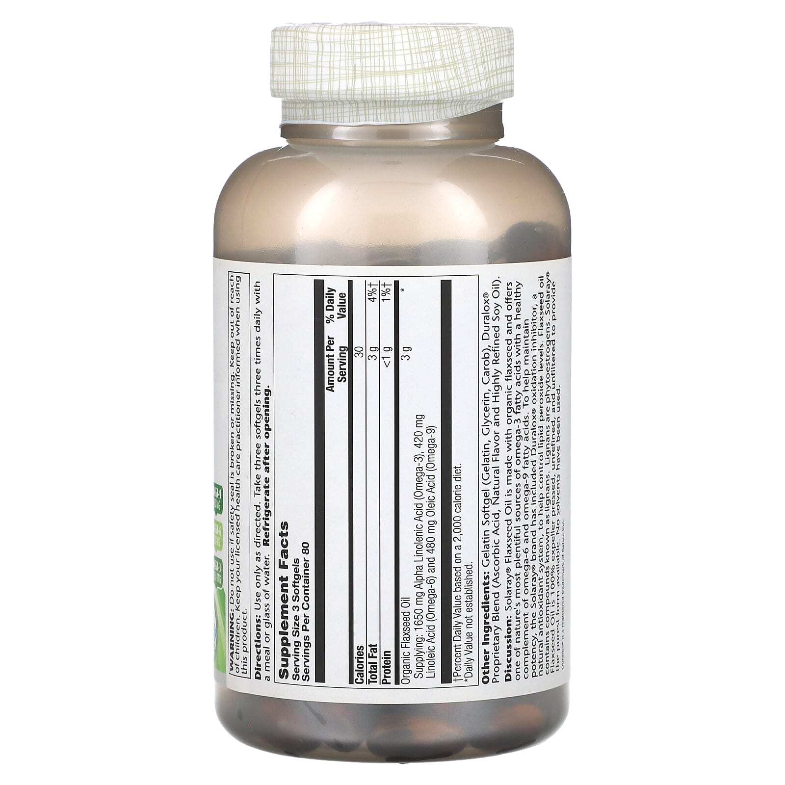Описание. Льняное масло Solaray® производится из органического льняного семени и является одним из самых богатых природных источников омега-3 жирных кислот с полезным набором омега-6 и омега-9 жирных кислот. Чтобы помочь сохранить потенцию, бренд Solaray® включил ингибитор окисления Duralox®, естественную антиоксидантную систему, которая помогает контролировать уровень перекиси липидов. Льняное масло содержит соединения, известные как лигнаны. Лигнаны - это фитоэстрогены. Льняное масло Solaray® - это 100% нерафинированное и нефильтрованное масло, полученное методом прессования шнековым прессом, чтобы обеспечить чистейшую доступную форму. Растворители не использовались.