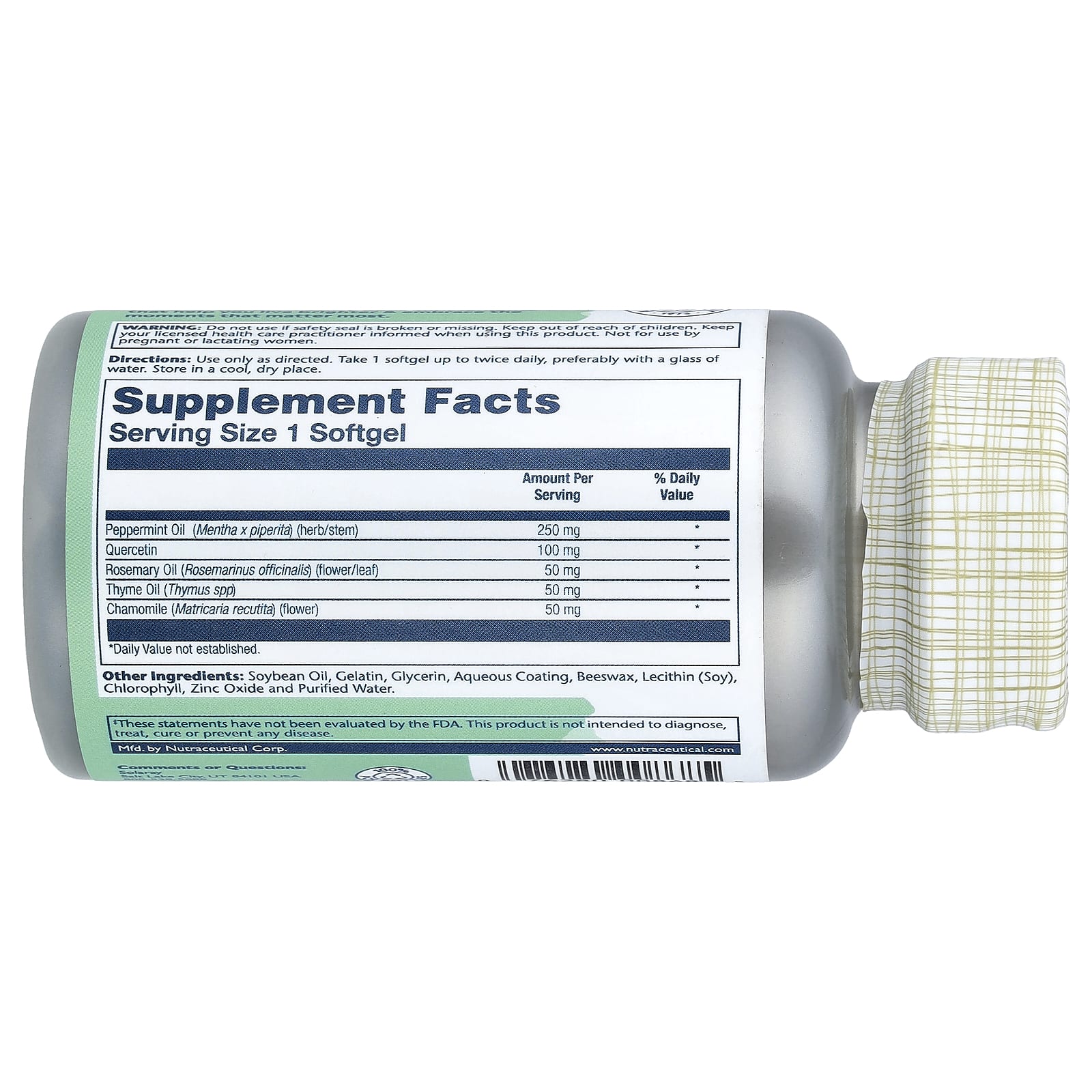 Соевое масло, желатин, глицерин, водорастворимое покрытие, пчелиный воск, лецитин (из сои), хлорофилла, оксид цинка и очищенная вода.