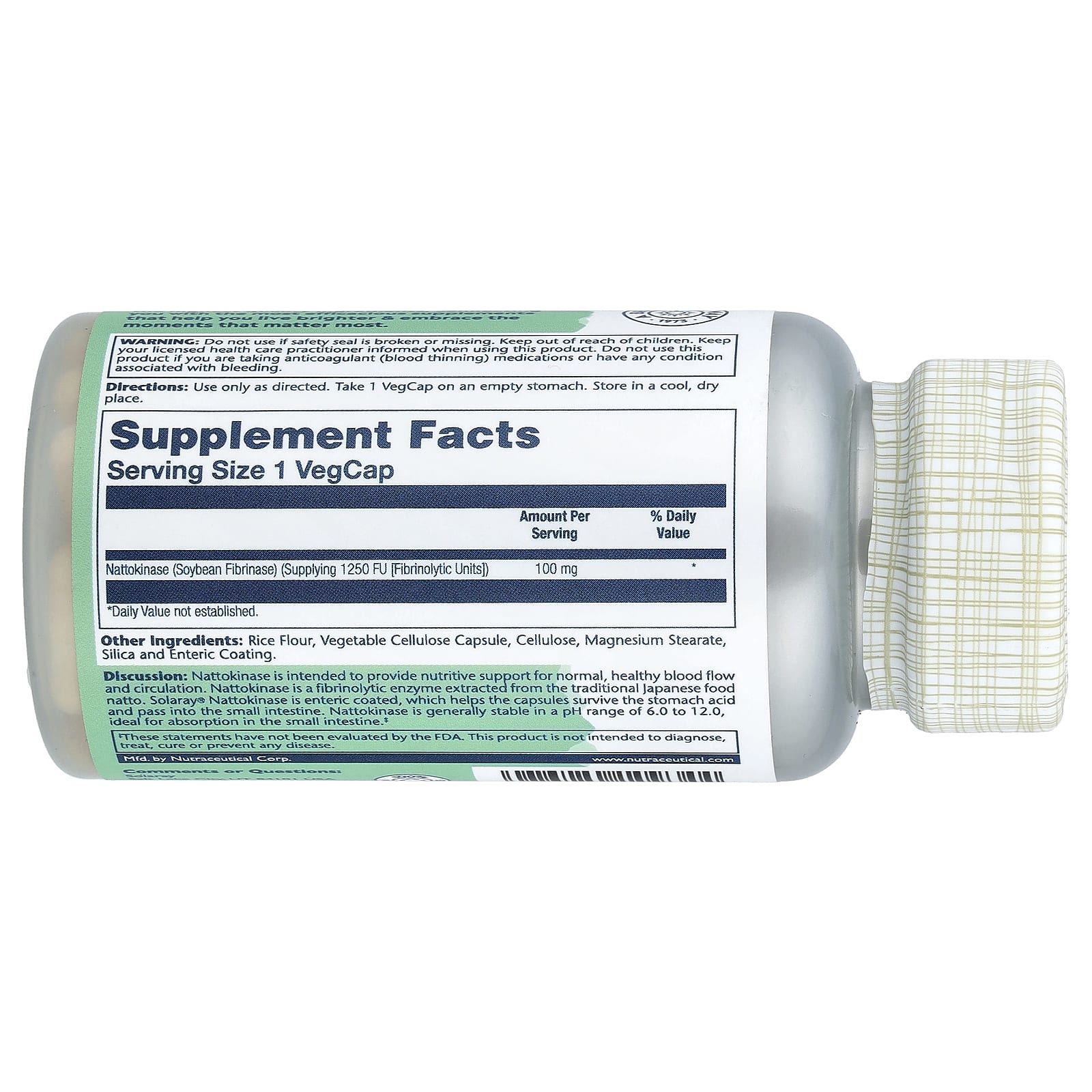 Описание. Наттокиназа предназначена для обеспечения питательной поддержки нормального, здорового кровотока и кровообращения. Наттокиназа - это фибринолитический фермент, получаемый из традиционного японского пищевого натто. Наттокиназа от Solaray® имеет кишечнорастворимую оболочку, которая помогает капсулам выдержать воздействие желудочного сока и проникать в тонкий кишечник. Наттокиназа обычно стабильна в диапазоне pH от 6,0 до 12,0, что идеально подходит для всасывания в тонком кишечнике.