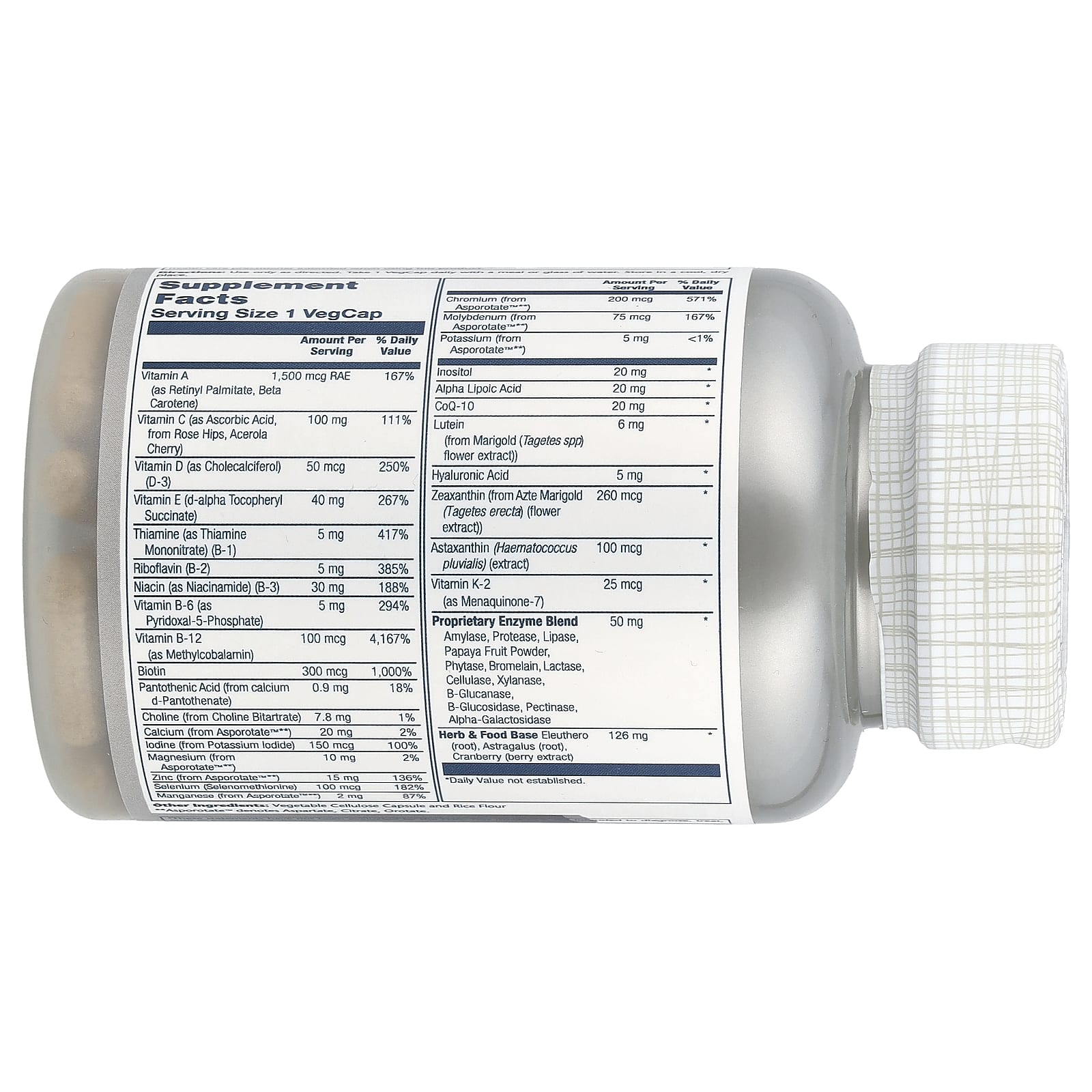 Мультивитамины для взрослых старше 50 лет от Solaray содержат эффективные, выращенные на солнце питательные продукты. В их состав входят растительные компоненты женьшеня и астрагала (Astragalus) для заряда энергии, коэнзим Q10, поддерживающий антиоксидантную активность, витамины D3 и K2, способствующие здоровью сердца, лютеин и зеаксантин для здоровья глаз, а также запатентованная смесь ферментов для улучшения пищеварения. Поскольку мы стремимся к созданию улучшенных формул для максимальной эффективности, наши мультивитамины для взрослых старше 50 лет содержат минералы в хелатной форме, предназначенные для улучшения усвоения и эффективного использования организмом.