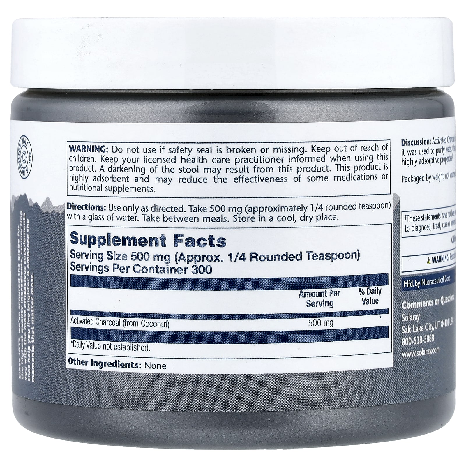 Не следует использовать продукт, если защитная плёнка повреждена или отсутствует. Хранить в недоступном для детей месте. Перед началом применения следует проконсультироваться с врачом. Продукт может привести к потемнению стула. Этот продукт обладает высокой абсорбирующей способностью и может снизить эффективность некоторых лекарств или пищевых добавок.