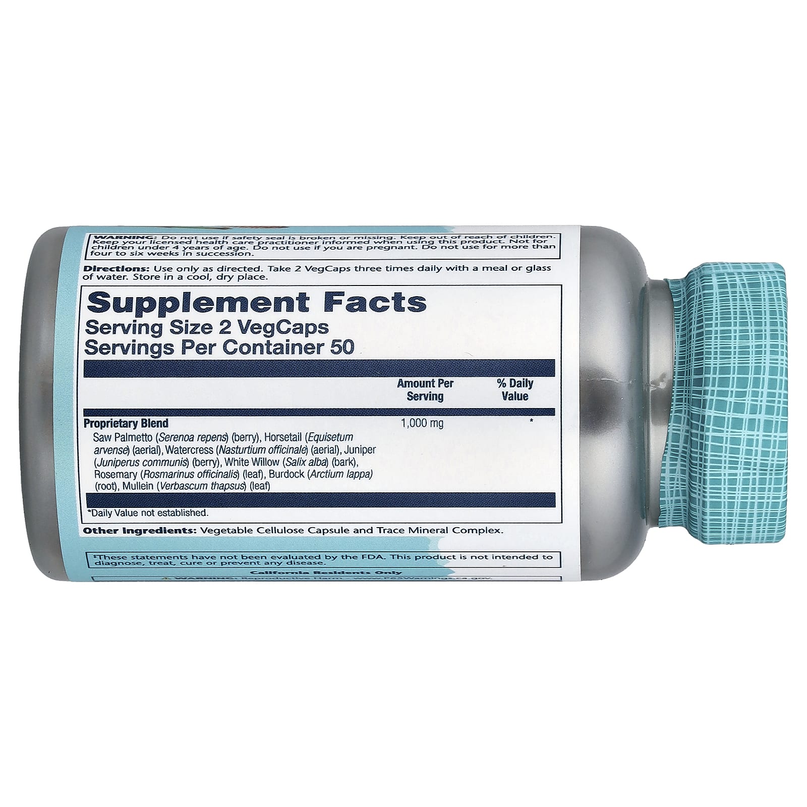 | Запатентованная смесь ягоды серенои (Serenoa repens), хвощ полевой (Equisetum arvense) (надземные части), жеруха (Nasturtium officinale) (надземные части), можжевельник (Juniperus communis), кора ивы белой (Salix alba), розмарин officinalis) (листья), лопух (Arctium lappa) (корень), коровяк (Verbascum thapsus) (листья) | 1 000 мг | * |