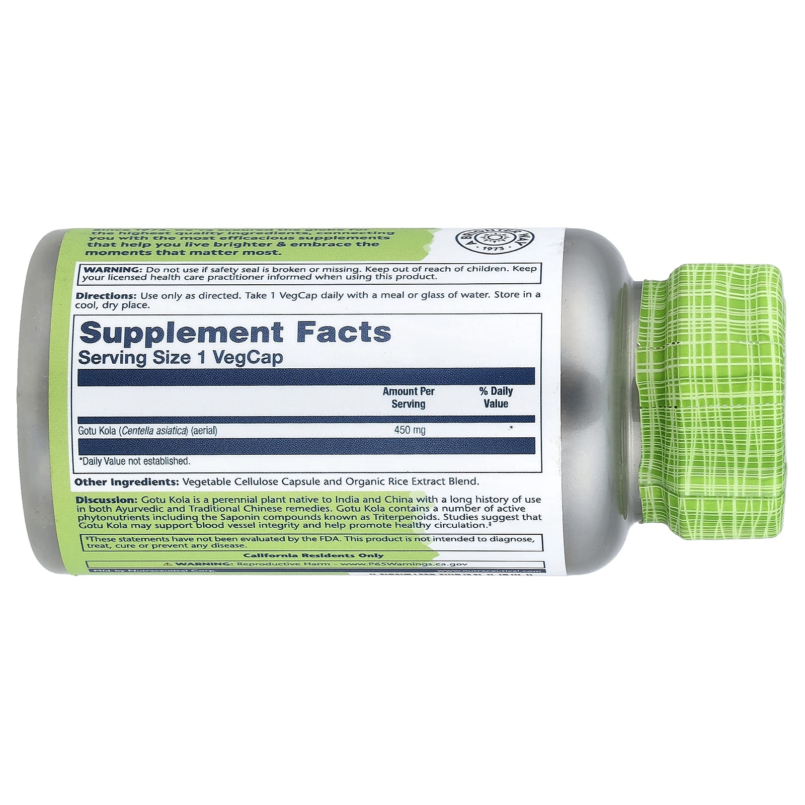 Описание. Готу кола - это многолетнее растение, произрастающее в Индии и Китае, которое давно используется как в аюрведических, так и в традиционных китайских средствах. Готу кола содержит ряд активных фитонутриентов, включая соединения сапонинов, известные как тритерпеноиды. Исследования показали, что готу кола может поддерживать целостность кровеносных сосудов и способствовать здоровому кровообращению.