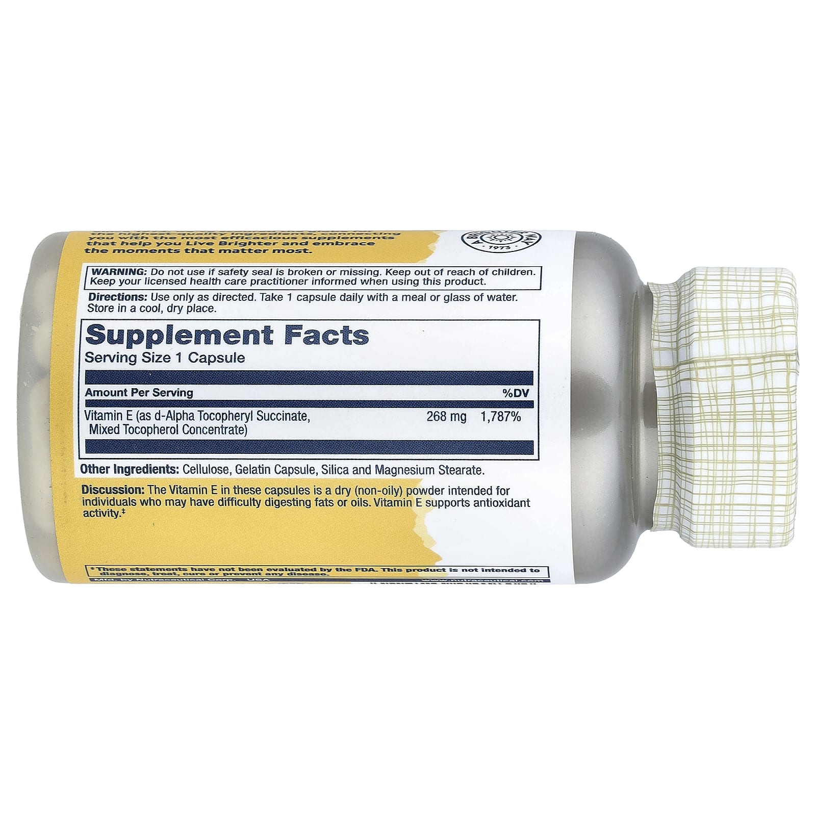 Описание. Витамин Е в этих капсулах находится в сухом (немасляном) порошке. Такая форма была создана специально для людей, которые могут испытывать трудности с перевариванием жиров или масел. Витамин E поддерживает антиоксидантную активность.