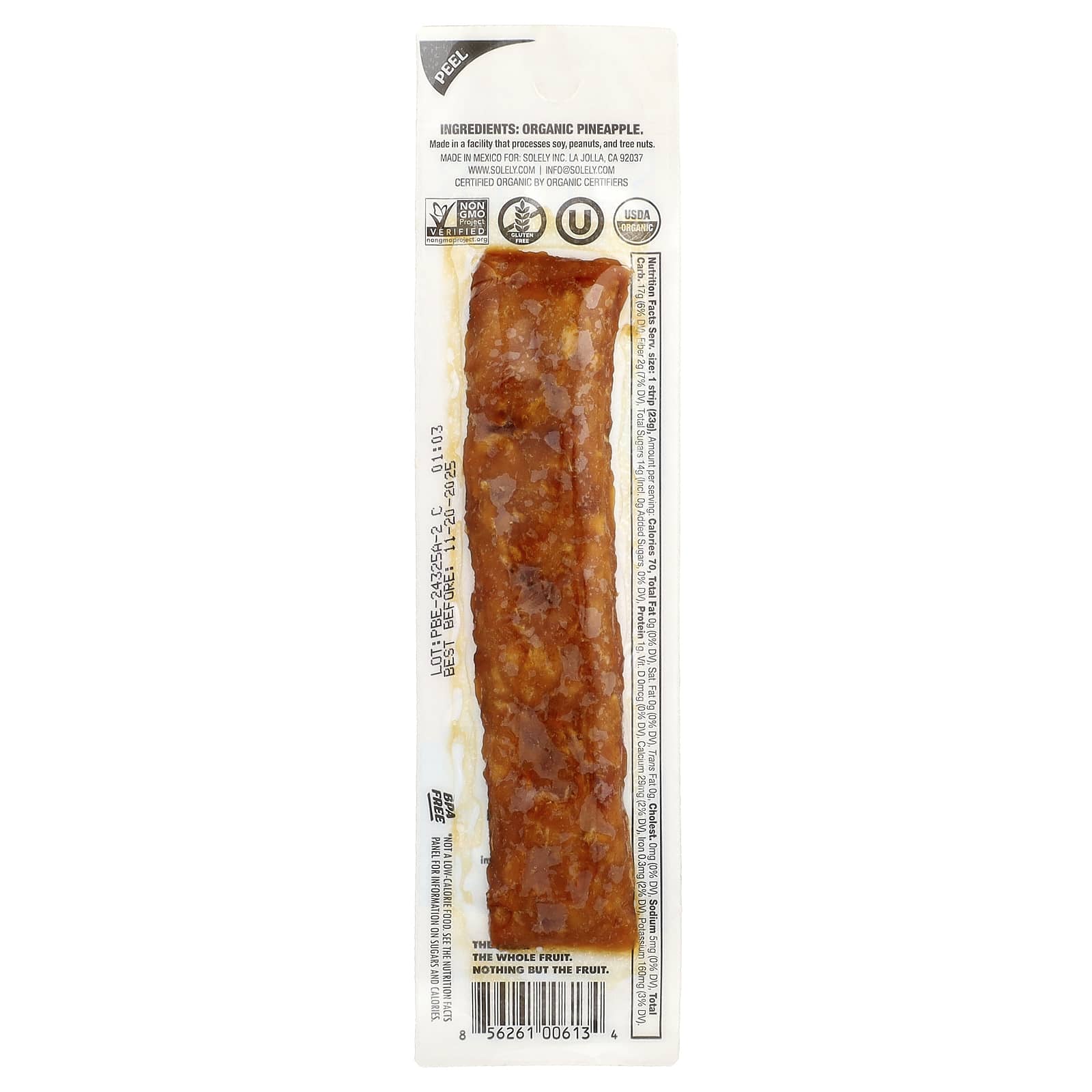 Органическое вяленое мясо ананаса от Solely® производится всего из 1 ингредиента: Органический ананас. Да, действительно. Мы обеспечиваем прозрачность, поэтому используем простые и цельные ингредиенты, указанные на лицевой стороне упаковки. Никогда не добавляйте сахар, консерванты и концентраты.