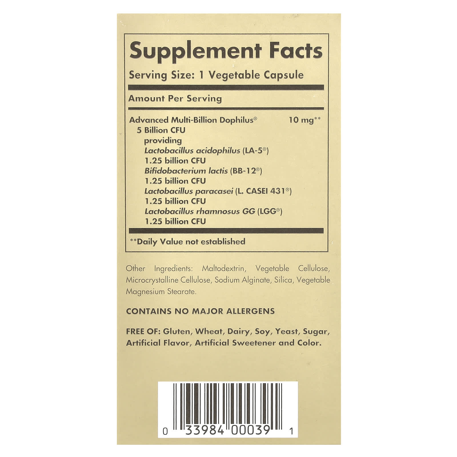 | Улучшенный Multi-Billion Dophilus® 5 млрд КОЕ предоставление Ацидофильные лактобактерии (Lactobacillus acidophilus) (LA-5®) 1,25 млрд КОЕ Бифидобактерии лактис (BB-12®) 1,25 млрд КОЕ Лактобактерии параказеи (L. CASEI 431®) 1,25 млрд КОЕ Лактобактерии рамнозус (Lactobacillus rhamnosus) (GG LGG®) 1,25 млрд КОЕ | 10 мг | ** |