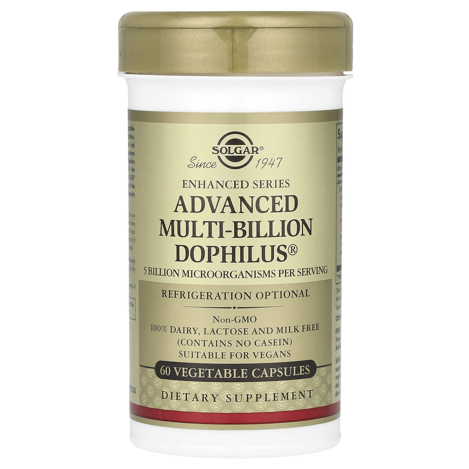 Вегетарианские капсулы Solgar® Advanced Multi-Billion Dophilus® являются источником ацидофильных лактобактерий (Lactobacillus acidophilus), бифидобактерий лактис (Bifidobacterium lactis), лактобактерий параказеи (Lactobacillus paracasei) и лактобактерий рамнозус (Lactobacillus rhamnosus), полезных микроорганизмов, которые обеспечивают бактерии, дружественные для пищеварительной системы. Этот продукт создан на основе хорошо известных штаммов LA-5®, BB-12®, L. casei 431® и LGG® и способствует здоровому функционированию кишечной системы. Кроме того, этот продукт поддерживает здоровую иммунную систему.