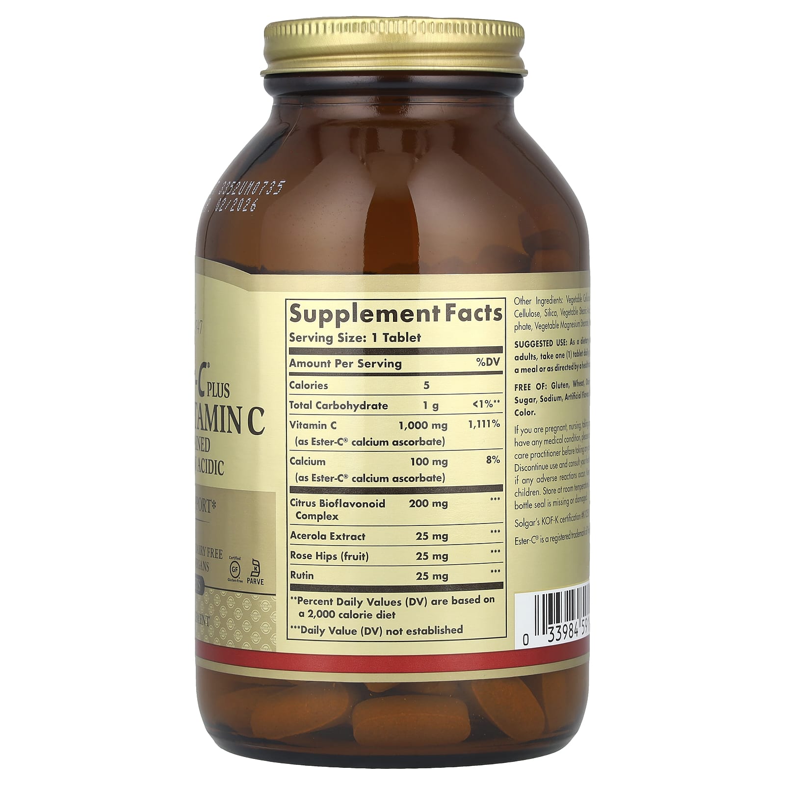 Ester-C® Plus — это эксклюзивная формула, разработанная компанией Solgar®, которая содержит запатентованный витамин С с нейтральным pH (без повышенной кислотности), не вызывающий раздражения желудка. Метаболиты витамина C в составе Ester-C® способствуют удержанию витамина C в клетках, обеспечивая дополнительное преимущество. Для производства уникального комплекса метаболитов аскорбата кальция используется особая технология. Этот комплекс метаболитов хорошо удерживается в организме, содержит полезные антиоксиданты и укрепляет иммунитет. В его состав входят натуральные биофлавоноиды и ягоды ацеролы, а также порошок плодов шиповника.