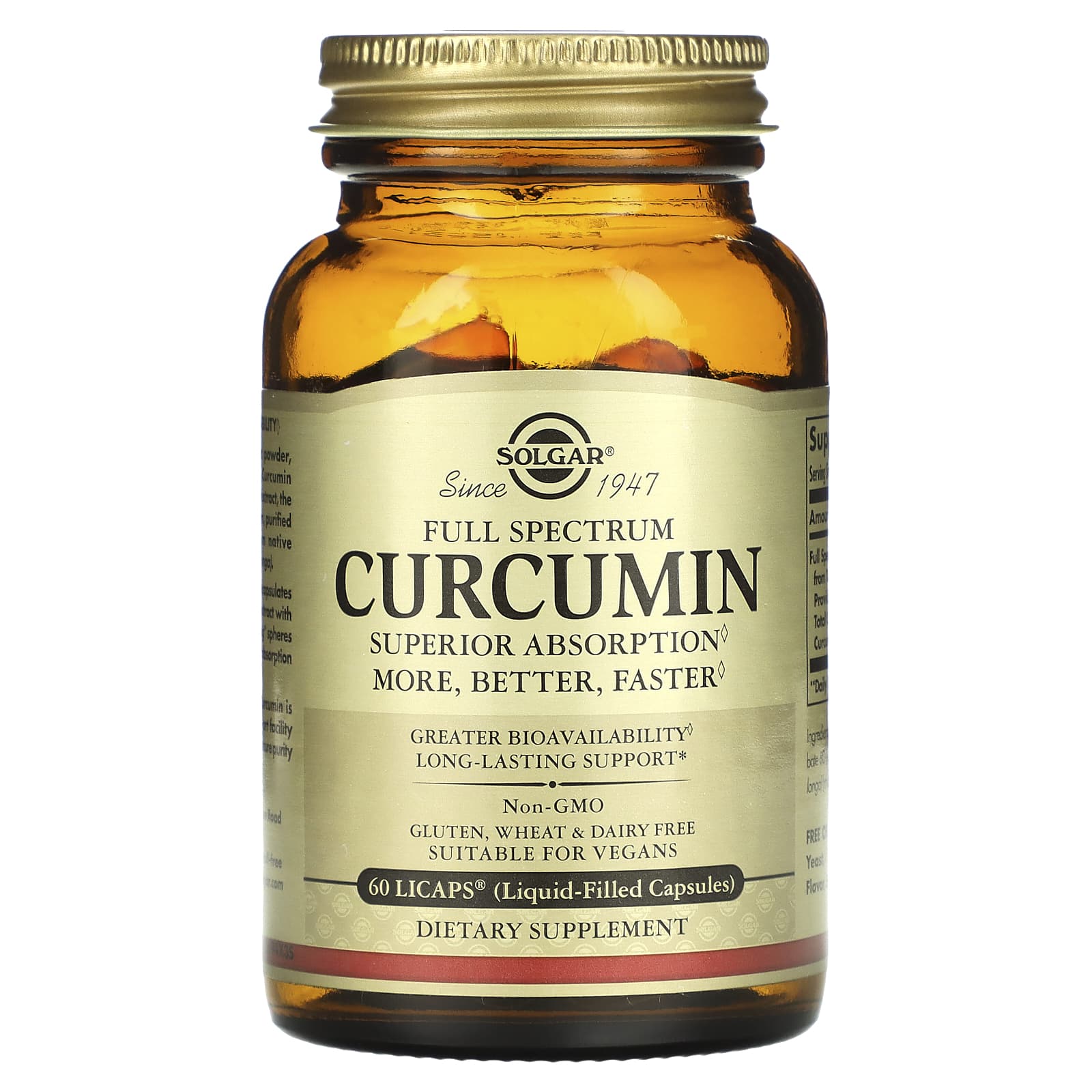 Больше, лучше, быстрее◊. Это отличительное свойство куркумина Full Spectrum от Solgar®. Фактически биодоступность препарата повышена в 185 раз◊. Впервые Solgar превращает плохо усваиваемый куркумин из жирорастворимого в водорастворимый фитонутриент — готовый к употреблению, быстроусвояемый и более активный, чем когда-либо прежде◊. Благодаря новой, усовершенствованной форме вещества 40 мг куркумина в одной капсуле эквивалентны десяткам капсул со 100 мг стандартизированного экстракта куркумина. Более того, недавнее клиническое исследование показало, что куркумин Full Spectrum от Solgar® действует дольше, чем натуральный экстракт куркумина. Благодаря Solgar у вас навсегда изменится представление о пользе куркумина для здоровья мозга, суставов и иммунной системы. Куркумин Full Spectrum от Solgar®: одна капсула один раз в день — в 185 раз полезнее◊.