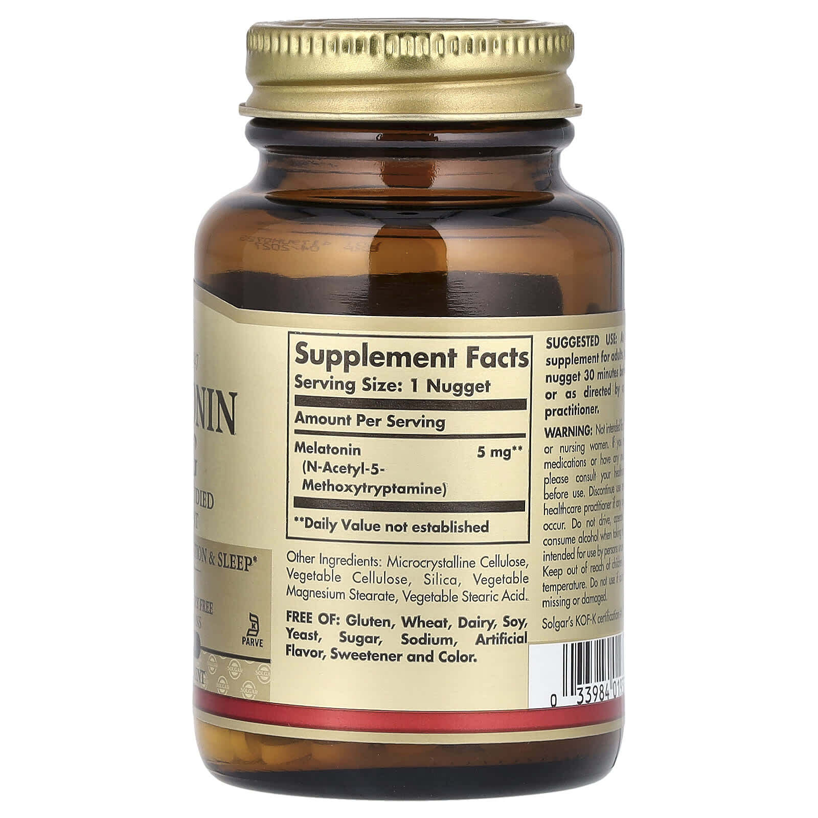 Мелатонин в таблетках по 5 мг от Solgar® — это отличный выбор для людей, страдающих от эпизодической бессонницы и нарушений суточного ритма организма в связи со сменой часовых поясов, а также для тех, кто хочет обеспечить себе полноценный здоровый сон. Этот продукт работает в соответствии с естественным циклом сна и бодрствования, обеспечивая вам спокойный отдых, которого вы заслуживаете, и помогая проснуться бодрым и отдохнувшим.