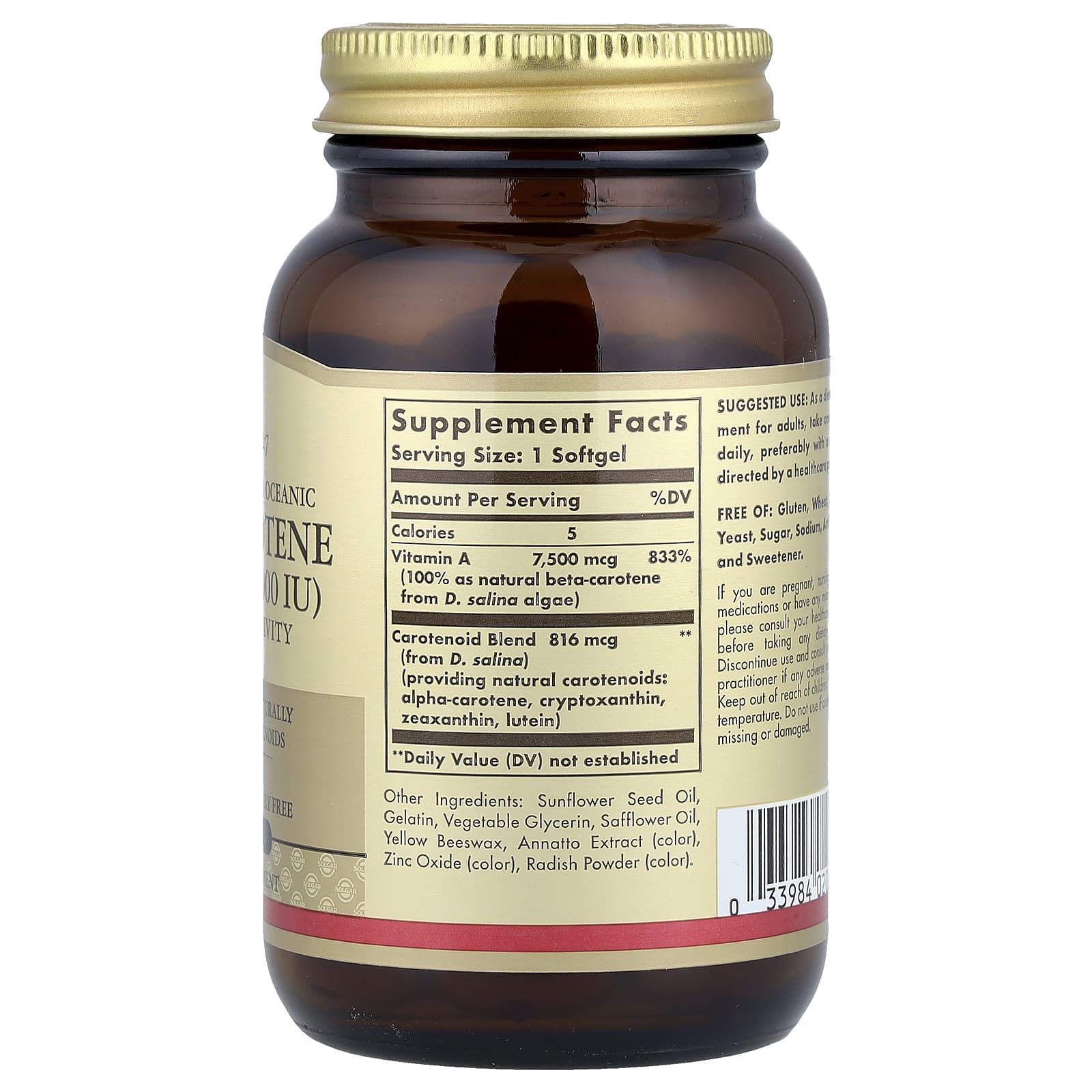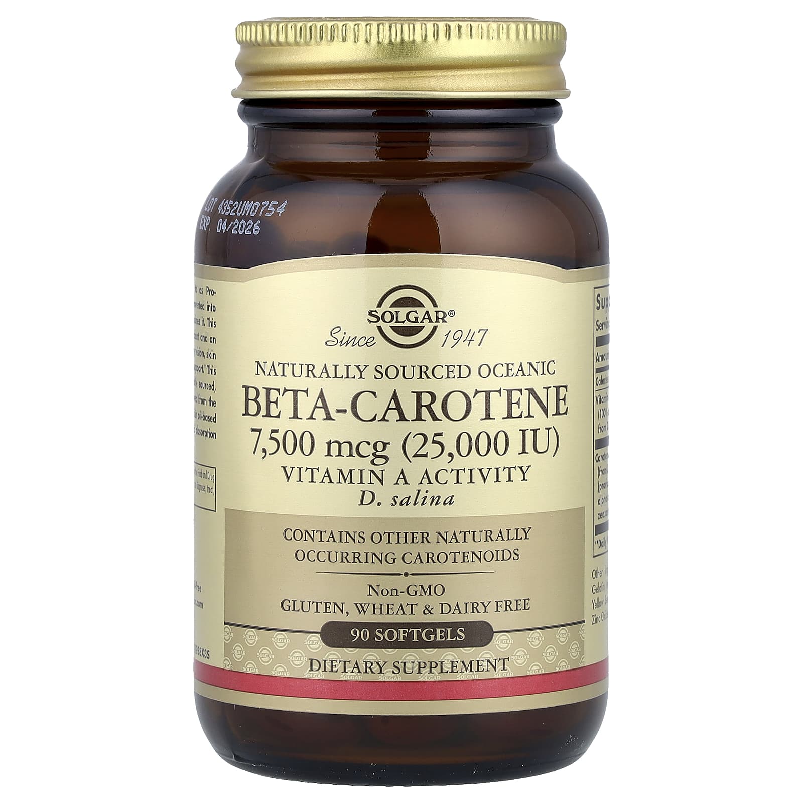 Бета-каротин называют провитамином А, поскольку он превращается в витамин А по мере необходимости. Этот фитонутриент является антиоксидантом и важным питательным веществом для хорошего зрения, кожи и поддержки иммунной системы. В этой формуле используется океанический бета-каротин природного происхождения, полученный из водоросли D. salina. Она выпускается в виде масляных капсул, что позволяет обеспечить оптимальное всасывание и усвоение.