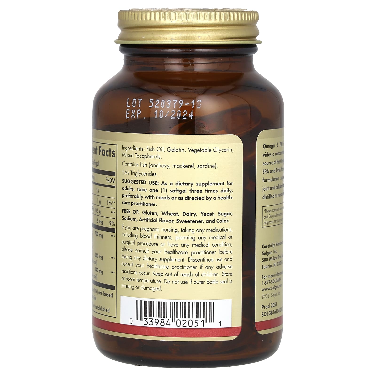 Омега-3 (700 мг) в форме триглицеридов — это натуральный концентрированный источник омега-3 полиненасыщенных кислот ЭПК и ДГК, полученных из холодноводной рыбы. Данная добавка помогает поддерживать здоровье сердечно-сосудистой системы, суставов и клеток. Продукт подвергается молекулярной дистилляции для очищения от ртути.