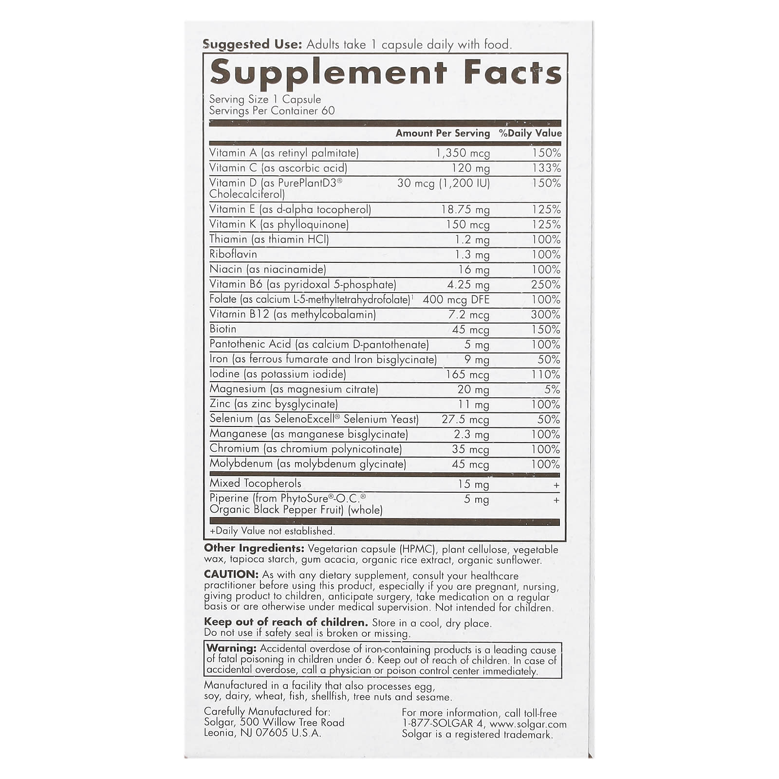 | Фолат (в виде кальций-L-5-метилтетрагидрофолата)1 | 400 мкг DFE | 100% |