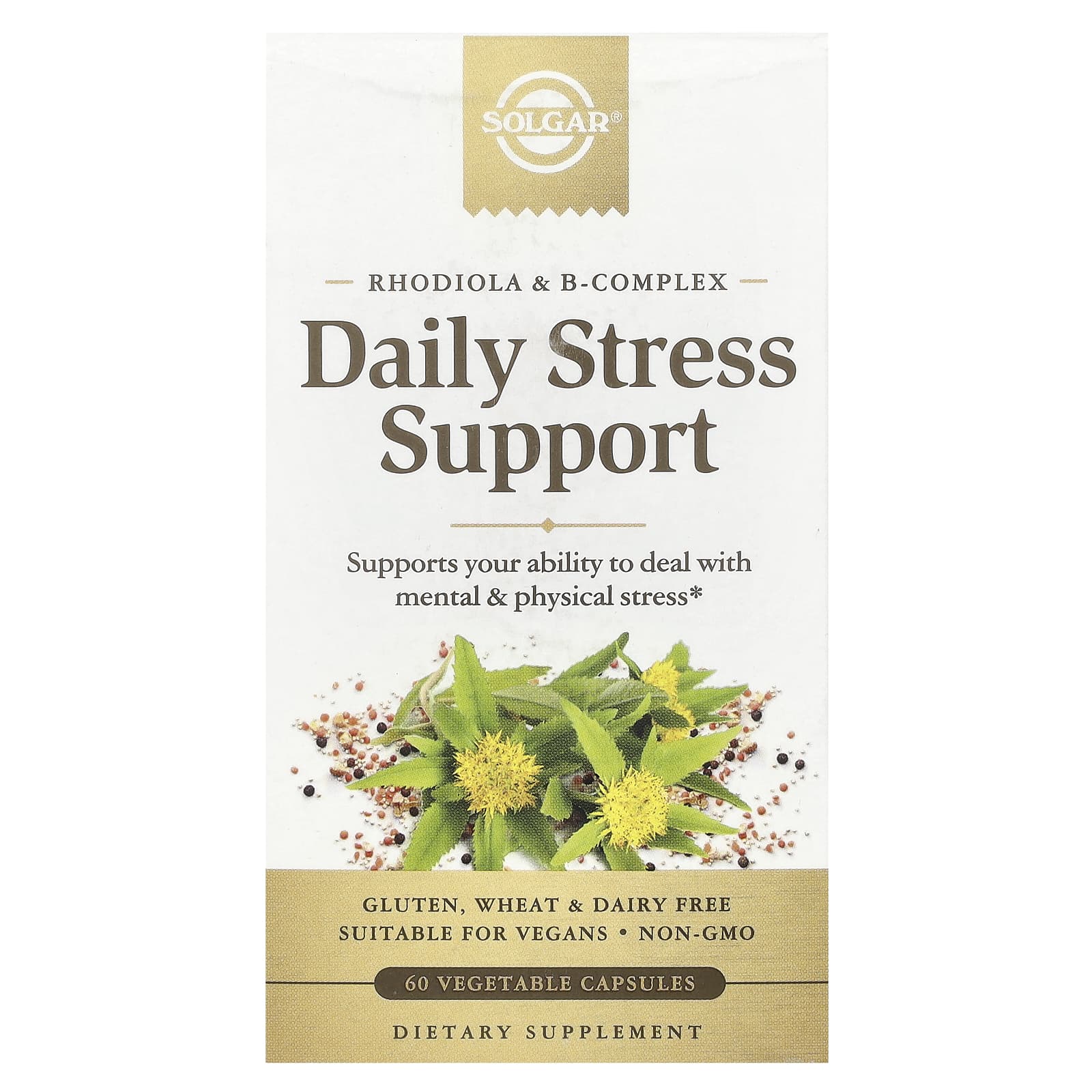 Solgar® Daily Stress Support содержит тщательно подобранную смесь ингредиентов, которые поддерживают вашу способность справляться как с умственным, так и с физическим стрессом.