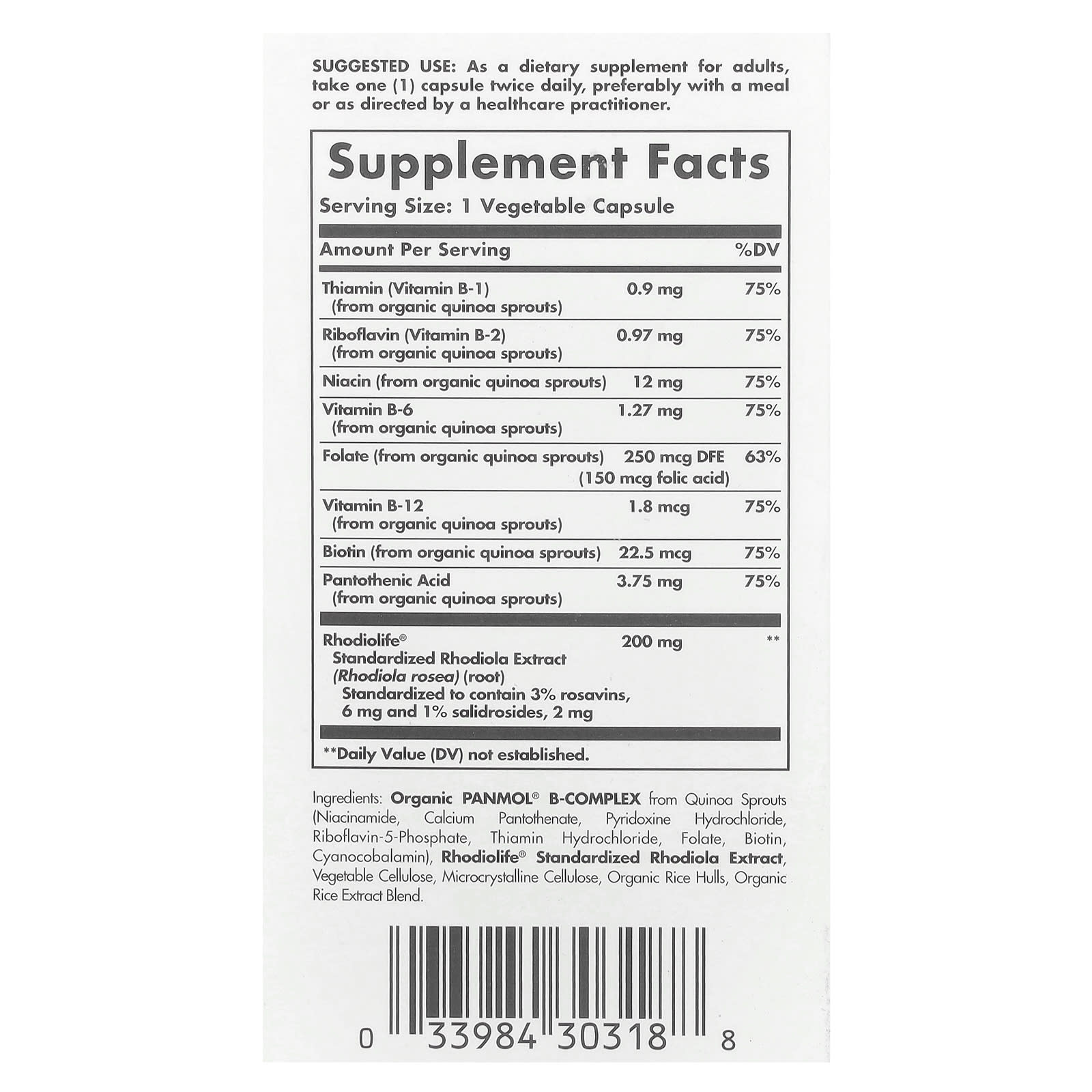 Органический b-комплекс Panmol® из ростков киноа (никотинамид, пантотенат кальция, пиридоксина гидрохлорид, рибофлавин-5-фосфат, тиамина гидрохлорид, фолат, биотин, цианокобаламин), стандартизированный экстракт родиолы rhodiolife®, целлюлоза растительного происхождения, микрокристаллическая целлюлоза, органические рисовые отруби, смесь экстрактов органического риса.