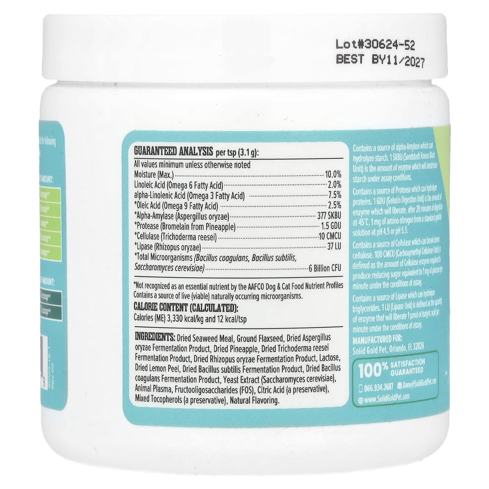 Мука из сушеных водорослей, молотое льняное семя, сушеный продукт ферментации из аспергилла (Aspergillus oryzae), сушеный ананас, сушеный продукт ферментации Trichoderma reesei, продукт ферментации сушеного ризопа (Rhizopus oryzae), лактоза, сушеная цедра лимона, продукт ферментации сушеной палочки (Bacillus subtilis), продукт ферментации сушеной палочки (Bacillus coagulans), дрожжевой экстракт (Saccharomyces cerevisiae), животная плазма, фруктоолигосахариды (ФОС), лимонная кислота (консервант), смешанные токоферолы (консервант), натуральный ароматизатор.
