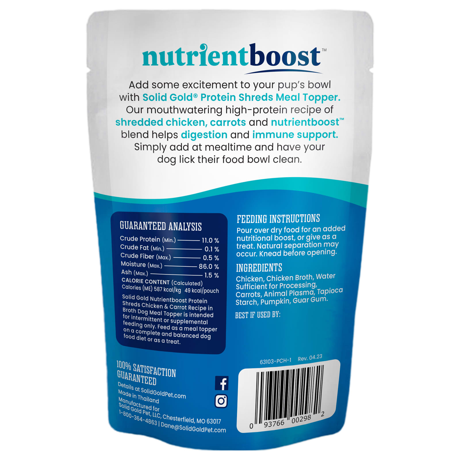 Solid Gold Nutrientboost Protein Shreds Рецепт курицы и моркови в бульоне Корм для собак предназначен только для периодического или дополнительного кормления. Используйте в качестве дополнения к полноценной и сбалансированной диете для собак или в качестве лакомства.