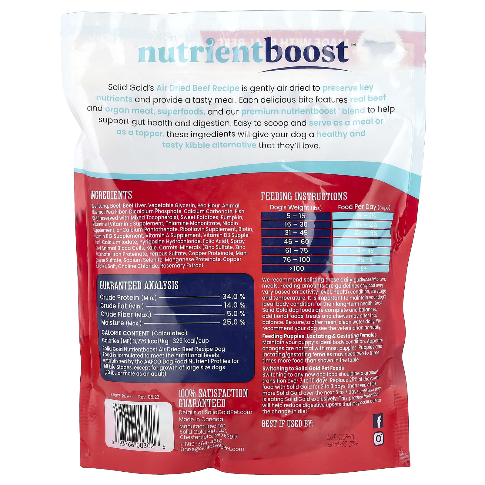 | Расчетная калорийность 3226 ккал / кг 329 ккал на чашку Корм для собак Solid Gold Nutrientboost Air Dried Beef разработан с учетом уровней питательных веществ, установленных в корме для собак AAFCO. Профили питательных веществ для всех возрастов, за исключением взрослых собак крупного размера (70 фунтов и более). | |
