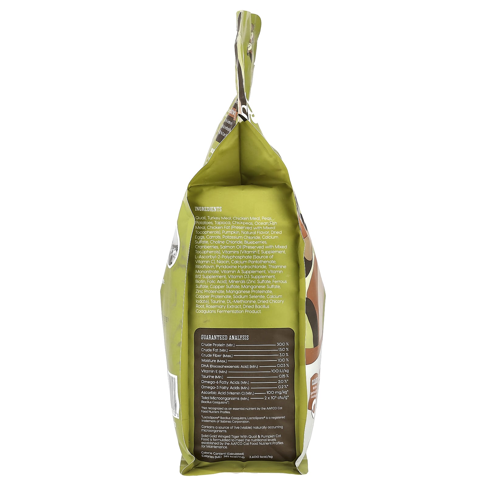 | * Не признано незаменимым питательным веществом в соответствии с профилями питательных веществ кормов для кошек AAFCO. † LactoSpore® Bacillus Coagulans, LactoSpore® является зарегистрированной торговой маркой Sabinsa Corporation. Содержит источник живых (жизнеспособных) микроорганизмов природного происхождения. Корм для кошек Solid Gold Winged Tiger с перепелами и тыквой разработан с учетом уровней питательных веществ, установленных в корме для кошек AAFCO. | |