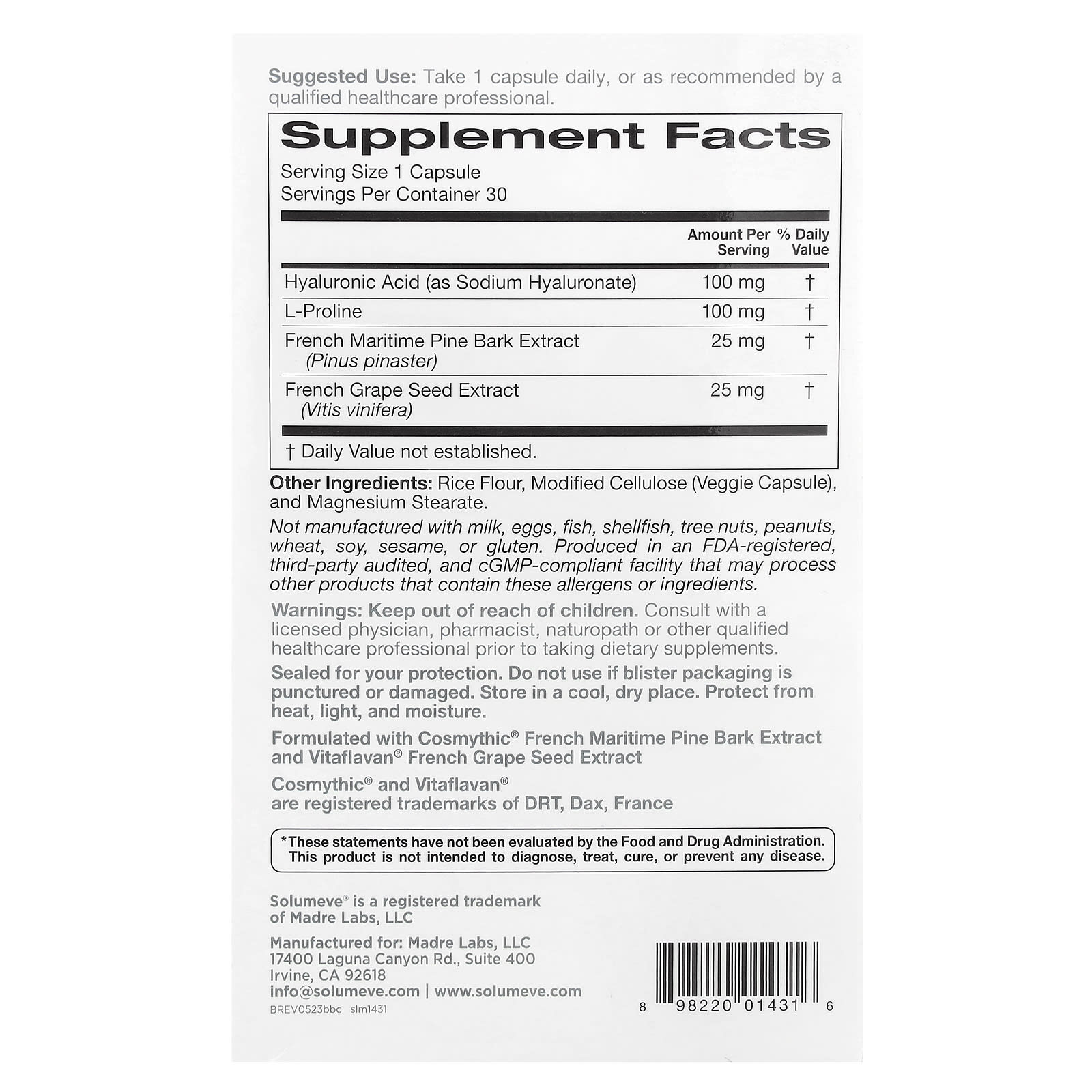 Гиалуроновая кислота (в виде гиалуроната натрия), L-пролин, экстракт коры французской приморской сосны (Pinus pinaster), экстракт косточек французского винограда (Vitis vinifera)