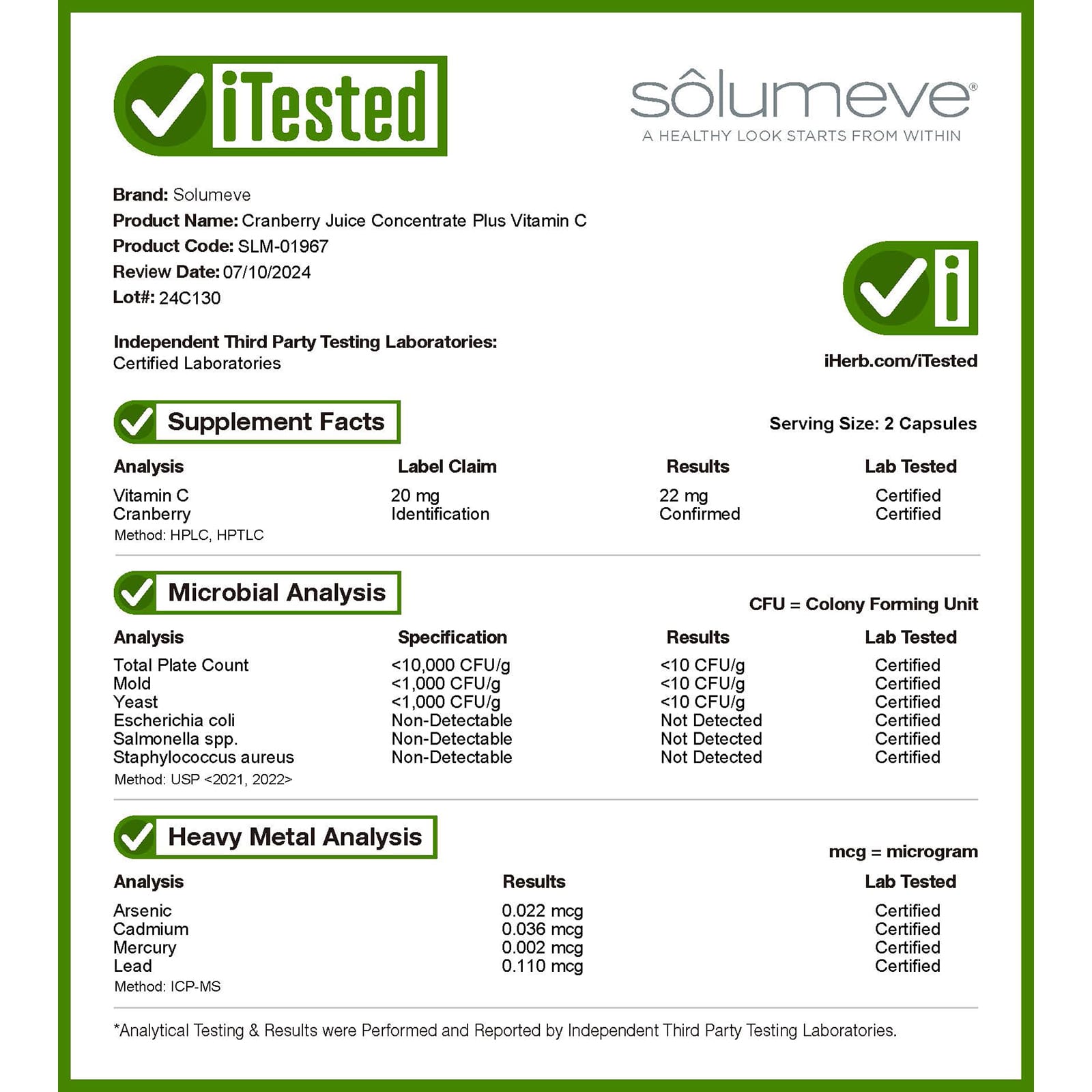 Концентрат клюквенного сока с витамином C от Sôlumeve содержит порошок из концентрата клюквенного сока (Vaccinium macrocarpon) и витамин C в растительных капсулах. Добавка подходит для вегетарианцев и веганов, и не содержит глютена, ГМО и сои.